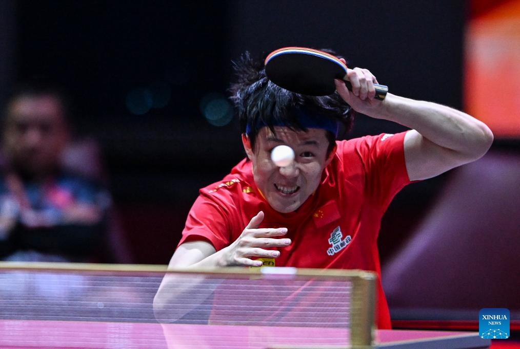 Wang Chuqin hits a return during the men's singles round of 32 match between Wang Chuqin of China and Wong Chun Ting of China's Hong Kong at ITTF World Table Tennis Championships Finals Doha 2025 in Doha, Qatar, May 20, 2025. (Xinhua/Liu Xu)