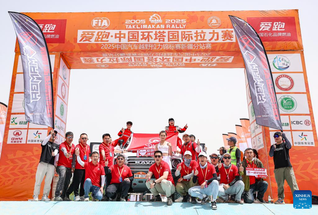 Driver Sun Xiangyan (Top R) and co-driver Ma Xin (Top L) of China pose for photos with the crew during the starting ceremony of the 2025 Taklimakan Rally in Aksu, northwest China's Xinjiang Uygur Autonomous Region, May 20, 2025. This year's Taklimakan Rally features 23 motorcycles and 105 vehicles, with racers set to tackle extreme heat and complex topography over approximately 5,200 kilometers, including 2,350 kilometers of timed special stages across deserts and Gobi plains, before concluding on June 1 in Makit County. (Xinhua/Hu Xingyu)