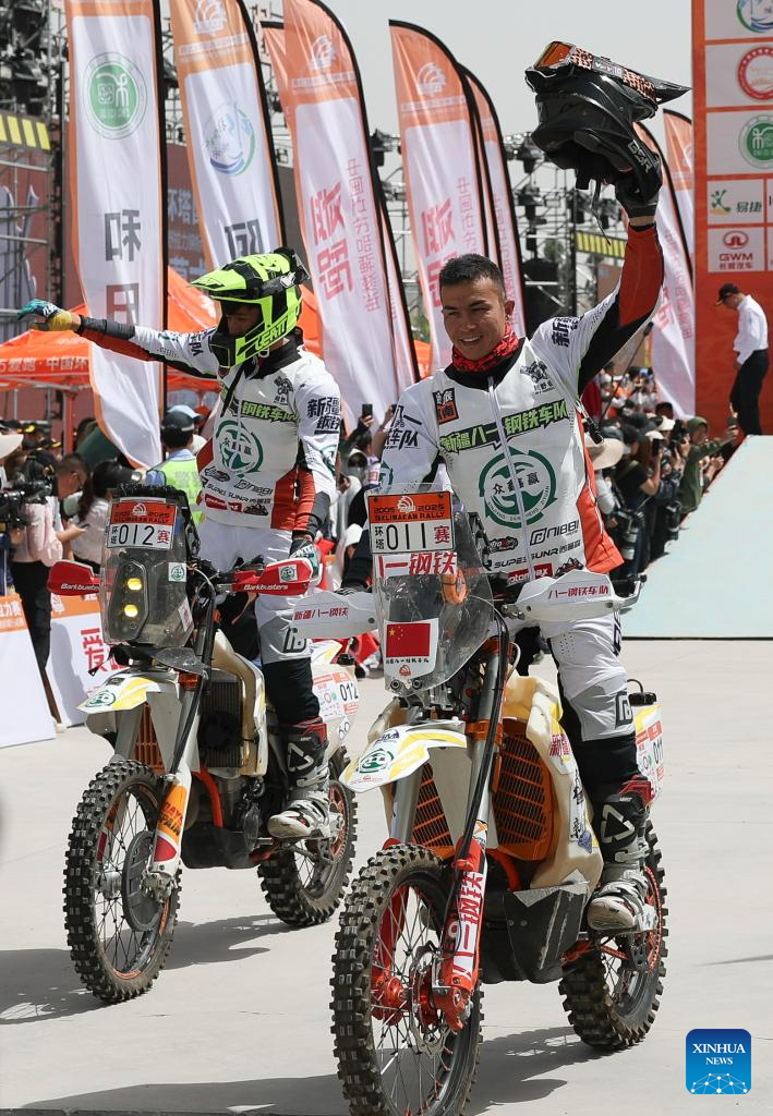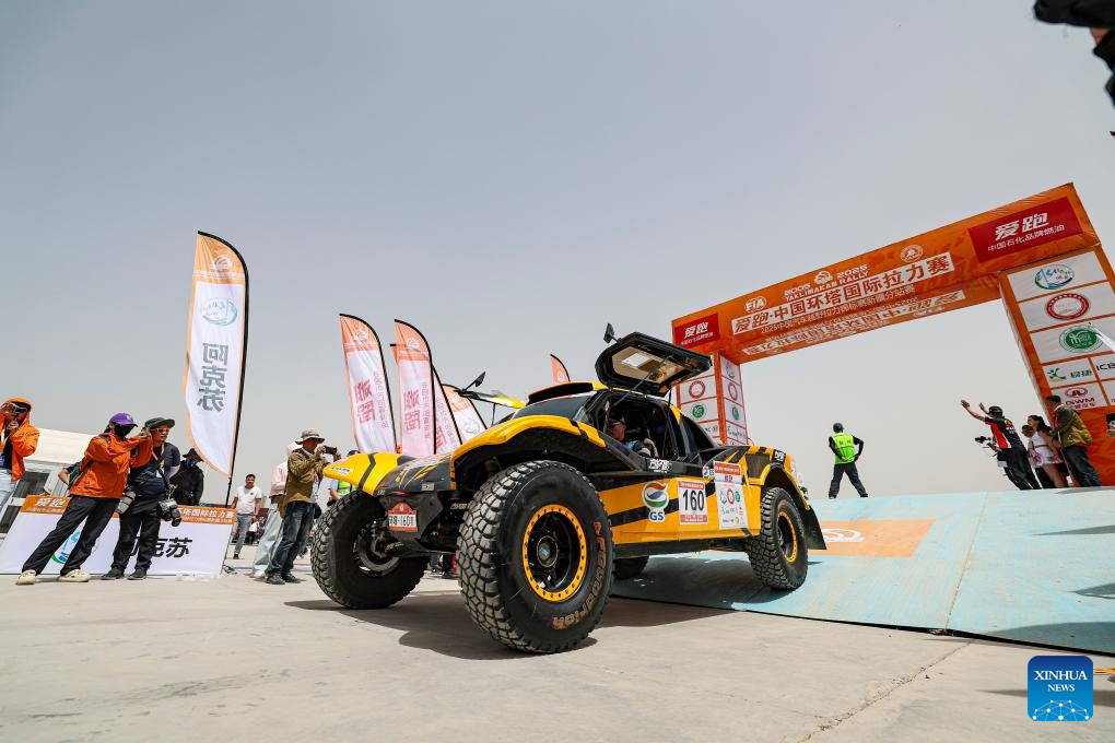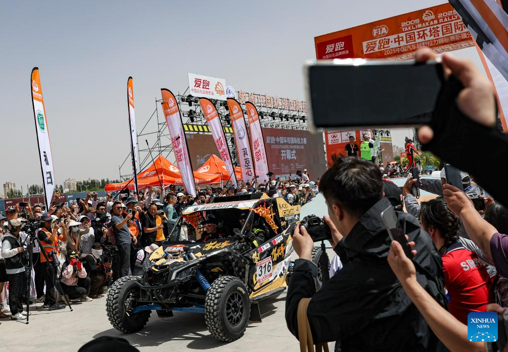 Driver Sun Zhibing and co-driver Huang Sheng of China set off during the starting ceremony of the 2025 Taklimakan Rally in Aksu, northwest China's Xinjiang Uygur Autonomous Region, May 20, 2025.