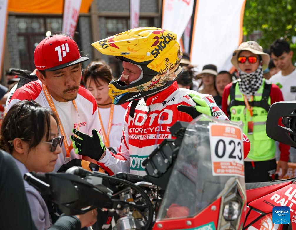 This year's Taklimakan Rally features 23 motorcycles and 105 vehicles, with racers set to tackle extreme heat and complex topography over approximately 5,200 kilometers, including 2,350 kilometers of timed special stages across deserts and Gobi plains, before concluding on June 1 in Makit County. (Xinhua/Hu Xingyu)