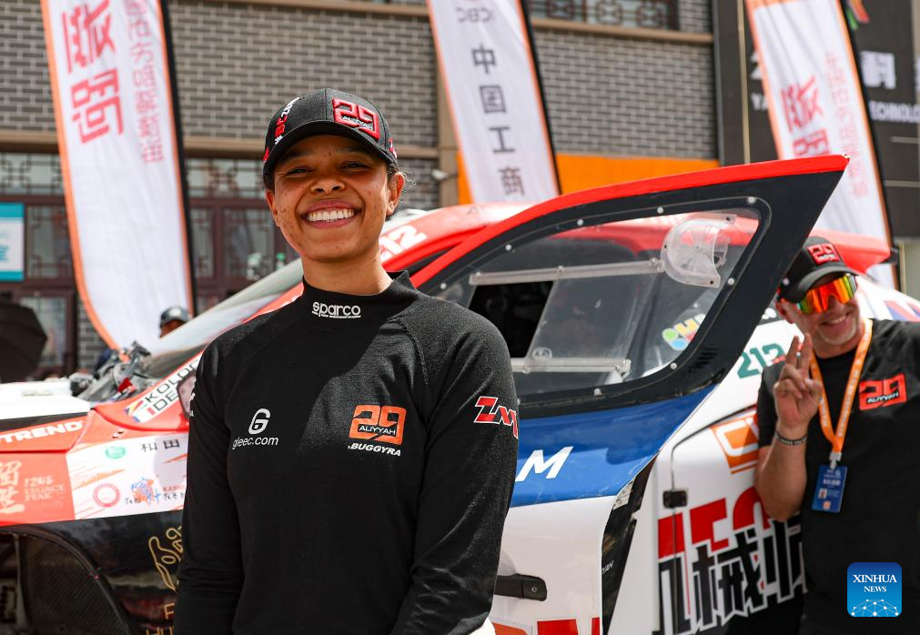 Driver Aliyyah Koloc of Seychelles reacts during the starting ceremony of the 2025 Taklimakan Rally in Aksu, northwest China's Xinjiang Uygur Autonomous Region, May 20, 2025.