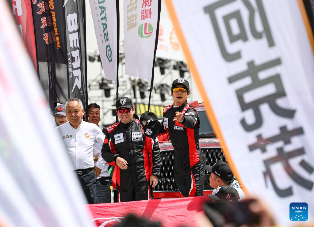 Driver Wu Jing and co-driver Liang Dongdong of China set off during the starting ceremony of the 2025 Taklimakan Rally in Aksu, northwest China's Xinjiang Uygur Autonomous Region, May 20, 2025.