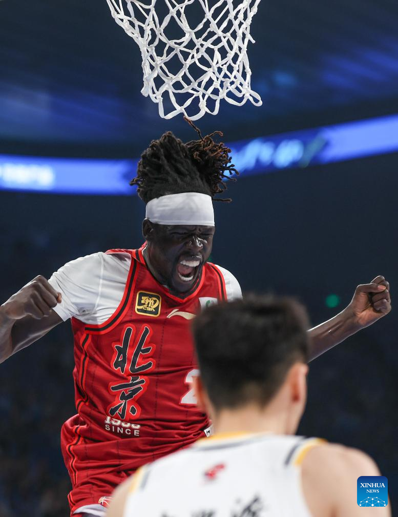 Nuni Omot (top) of Beijing Ducks celebrates scoring during the game 6 between Beijing Ducks and Zhejiang Lions at the 2024-2025 season Finals of the Chinese Basketball Association (CBA) league in Beijing, capital of China, May 20, 2025. (Xinhua/Wang Kaiyan)