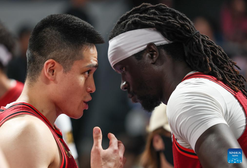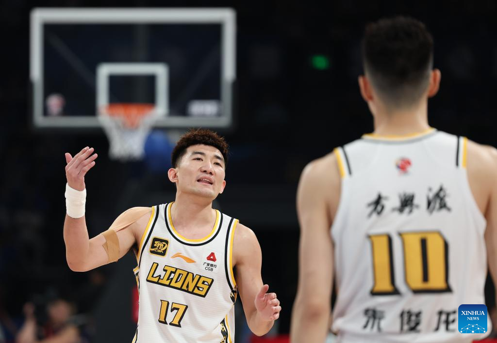 Sun Minghui (L) of Zhejiang Lions talks to his teammate during the game 6 between Beijing Ducks and Zhejiang Lions at the 2024-2025 season Finals of the Chinese Basketball Association (CBA) league in Beijing, capital of China, May 20, 2025. (Xinhua/Wang Kaiyan)