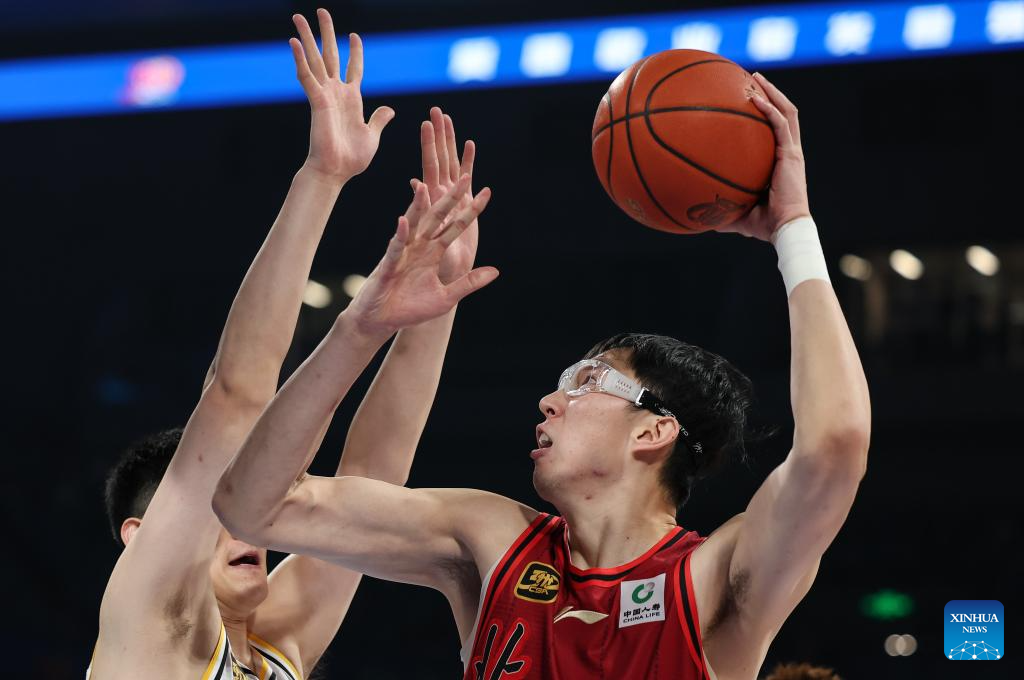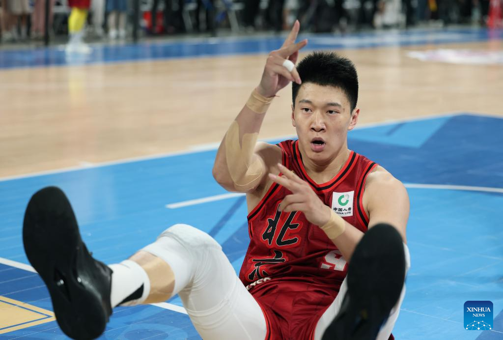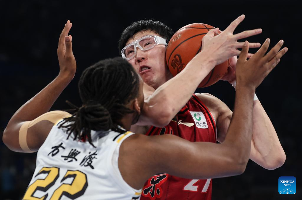 Zhou Qi (R) of Beijing Ducks competes during the game 6 between Beijing Ducks and Zhejiang Lions at the 2024-2025 season Finals of the Chinese Basketball Association (CBA) league in Beijing, capital of China, May 20, 2025. (Xinhua/Wang Kaiyan)
