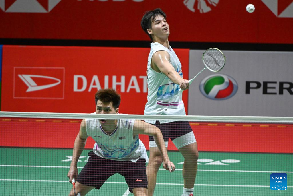 Huang Di (L)/Liu Yang compete during the men's doubles round of 32 match between Huang Di/Liu Yang of China and Hoki Takuro/Kobayashi Yugo of Japan at 2025 Malaysia Masters badminton tournament in Kuala Lumpur, Malaysia, May 20, 2025. (Photo by Chong Voon Chung/Xinhua)