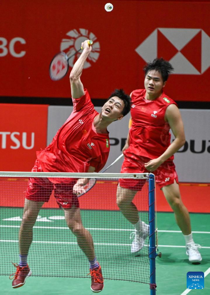 Huang Di/Liu Yang (R) compete during the men's doubles round of 32 match between Huang Di/Liu Yang of China and Hoki Takuro/Kobayashi Yugo of Japan at 2025 Malaysia Masters badminton tournament in Kuala Lumpur, Malaysia, May 20, 2025. (Photo by Chong Voon Chung/Xinhua)