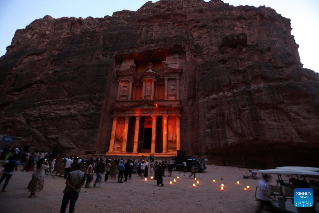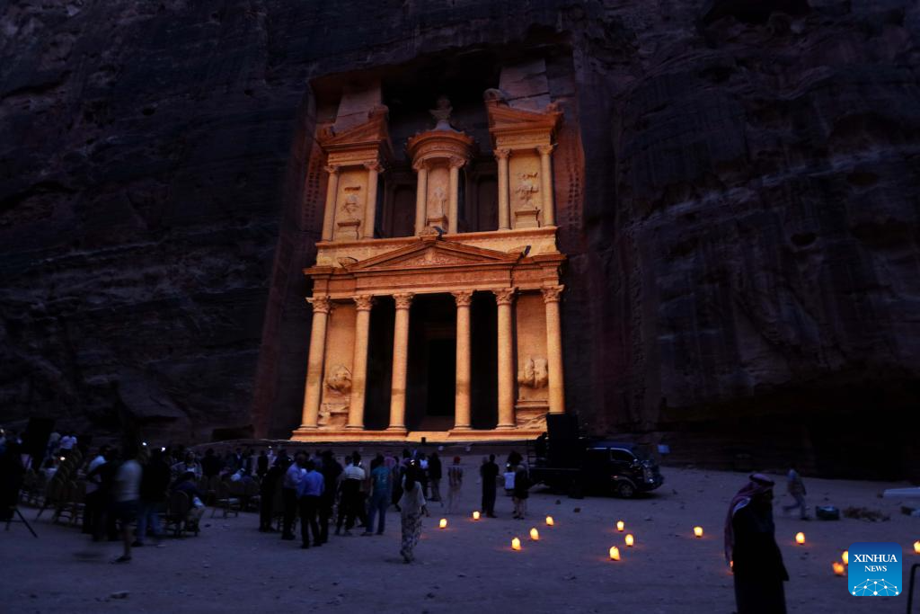 A light show is staged at the archaeological site of Petra, Jordan, on May 20, 2025. Jordan's Petra is a unique archaeological Nabataean city carved into rock, recognized as a UNESCO World Heritage Site since 1985. (Photo by Mohammad Abu Ghosh/Xinhua)