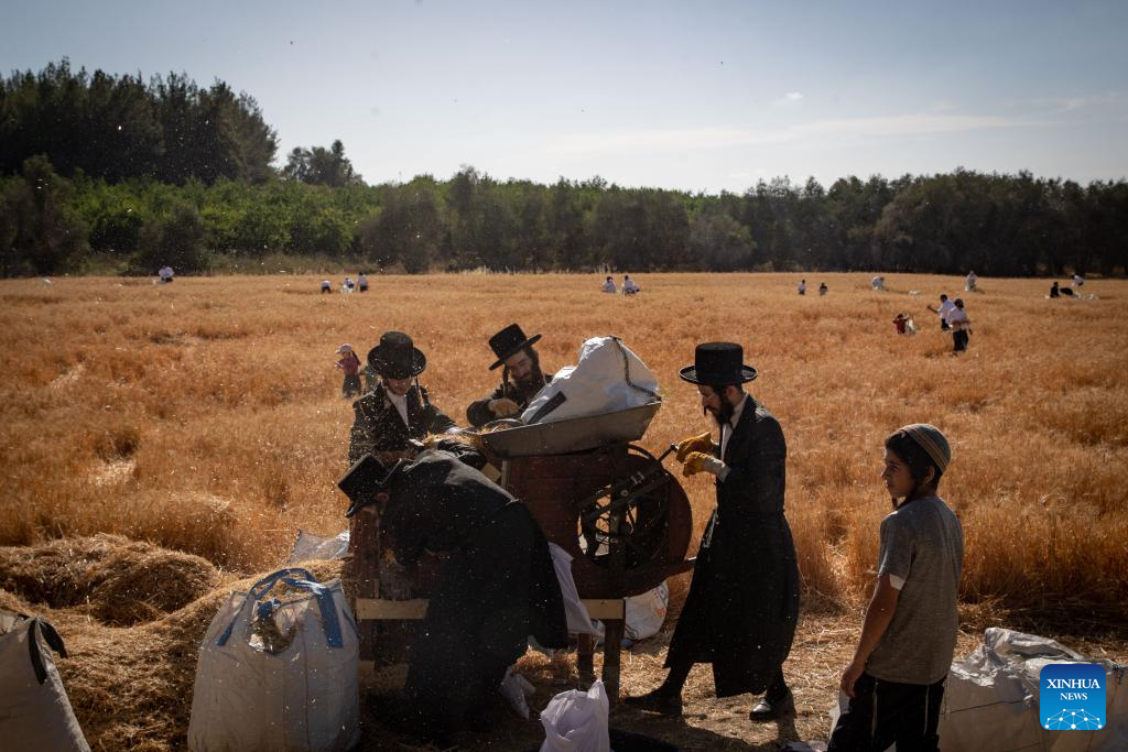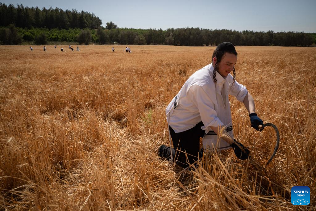 Ultra-Orthodox Jews harvest wheat as part of an annual ritual ahead of the Jewish holiday of Shavuot, in a field near Jerusalem on May 20, 2025. (Xinhua/Chen Junqing)