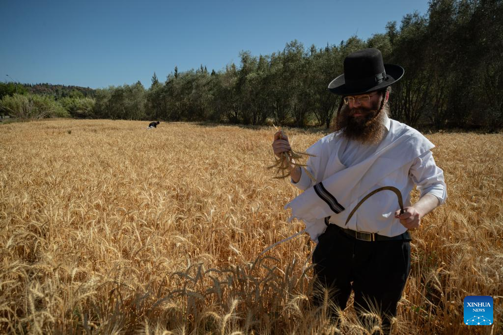 An ultra-Orthodox Jew harvests wheat as part of an annual ritual ahead of the Jewish holiday of Shavuot, in a field near Jerusalem on May 20, 2025. (Xinhua/Chen Junqing)
