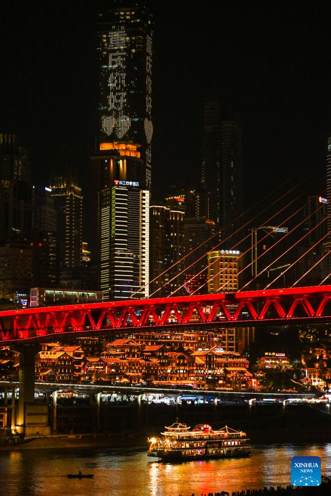 This photo taken on May 19, 2025 shows a night view of Chongqing Municipality, southwest China. In recent years, Chongqing has revitalized its riverfronts along the Yangtze and Jialing Rivers, integrating nature and urban development to showcase its iconic landscape featuring mountains, rivers, cityscape and bridges. (Xinhua/Wang Quanchao)