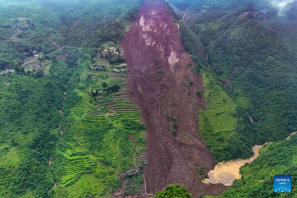A drone photo taken on May 22, 2025 shows the site where a landslide took place in Qingyang Village, Guowa Township of Dafang County, southwest China's Guizhou Province. Two separate landslides struck Changshi and Guowa townships in Dafang County, southwest China's Guizhou Province on Thursday, trapping approximately a dozen individuals. The two landslides struck at around 3 a.m. and 9 a.m. Thursday. Two people were trapped in Changshi, and several others were trapped in Qingyang Village of Guowa. Rescue efforts are underway. (Xinhua)