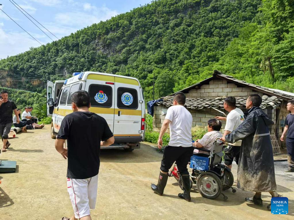 Rescuers transfer residents in Qingyang Village, Guowa Township of Dafang County, southwest China's Guizhou Province, on May 22, 2025. Two separate landslides struck Changshi and Guowa townships in Dafang County, southwest China's Guizhou Province on Thursday, trapping approximately a dozen individuals.