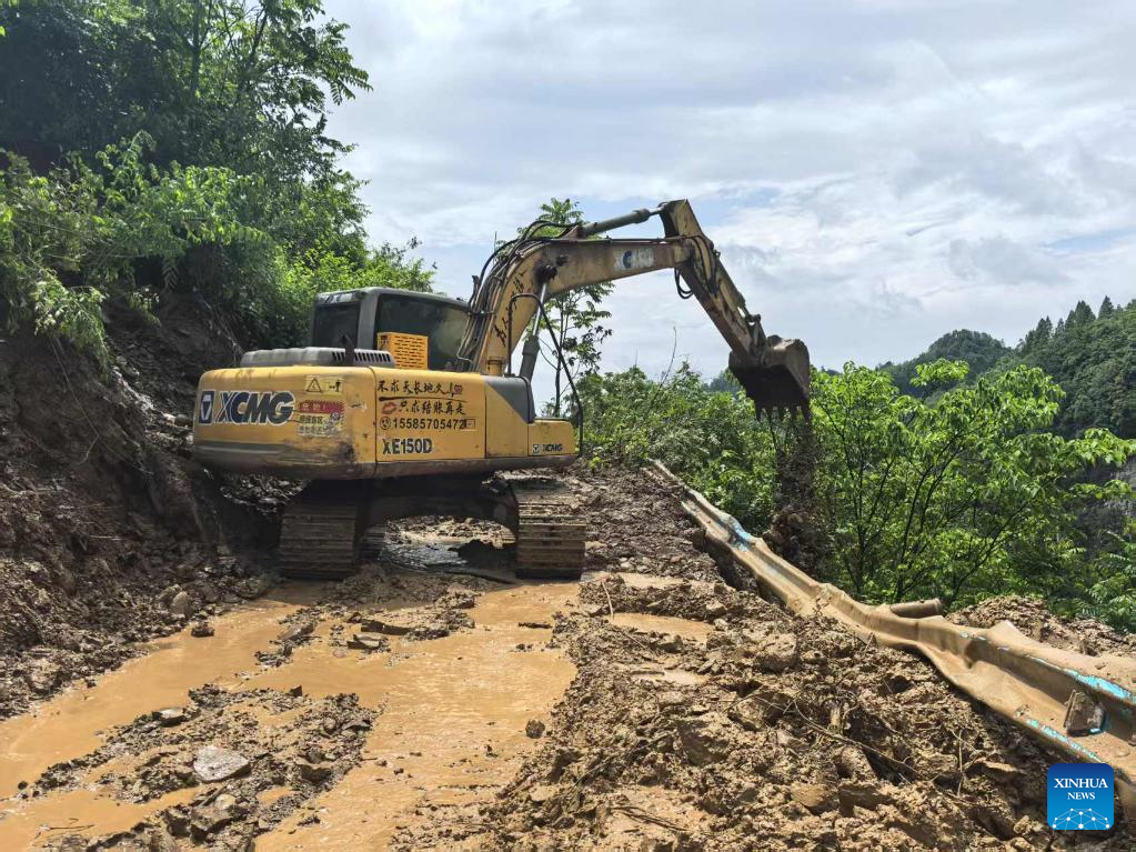 An excavator clears roads in Qingyang Village, Guowa Township of Dafang County, southwest China's Guizhou Province, on May 22, 2025. Two separate landslides struck Changshi and Guowa townships in Dafang County, southwest China's Guizhou Province on Thursday, trapping approximately a dozen individuals.