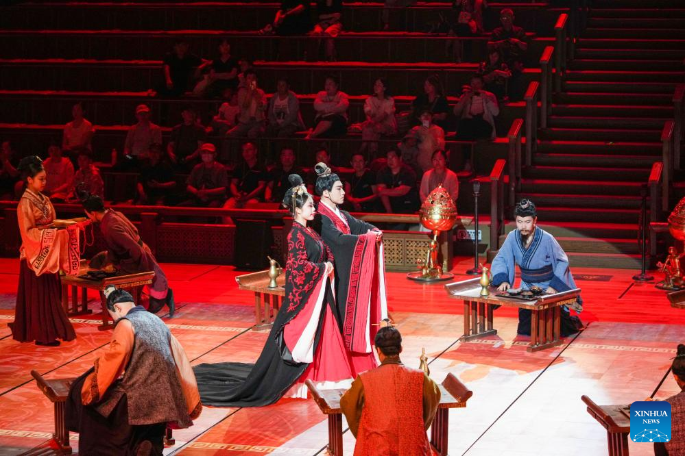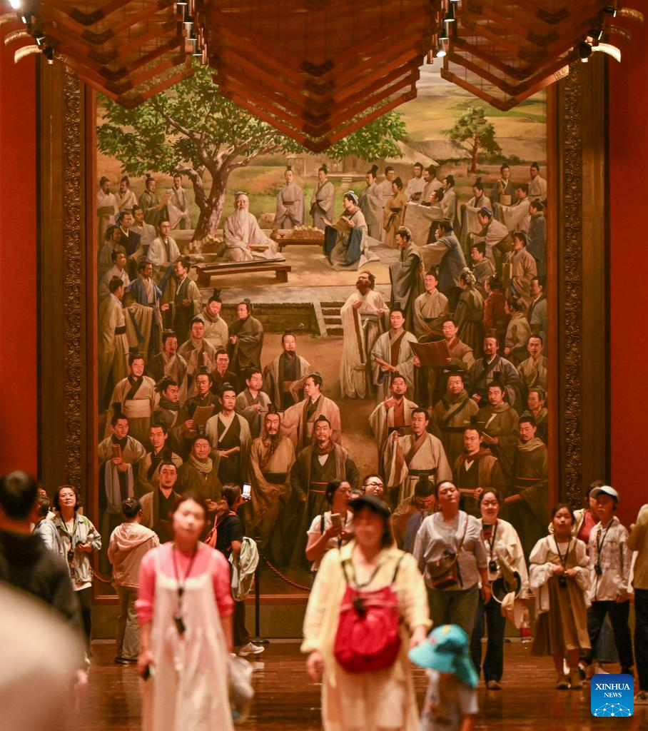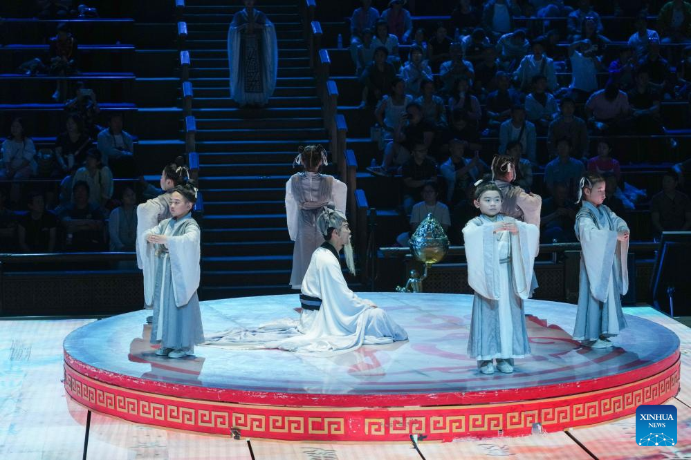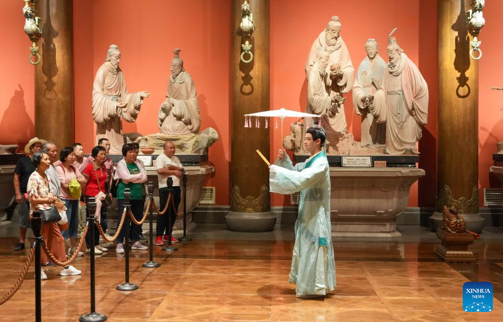 Artists stage a performance on confucianism in Qufu, east China's Shandong Province, May 21, 2025. Qufu, the birthplace of the renowned philosopher Confucius, has been blending Confucian culture with tourism, featuring a variety of art performances, exhibitions and folk culture activities, which attract many visitors each year. (Xinhua/Xu Suhui)