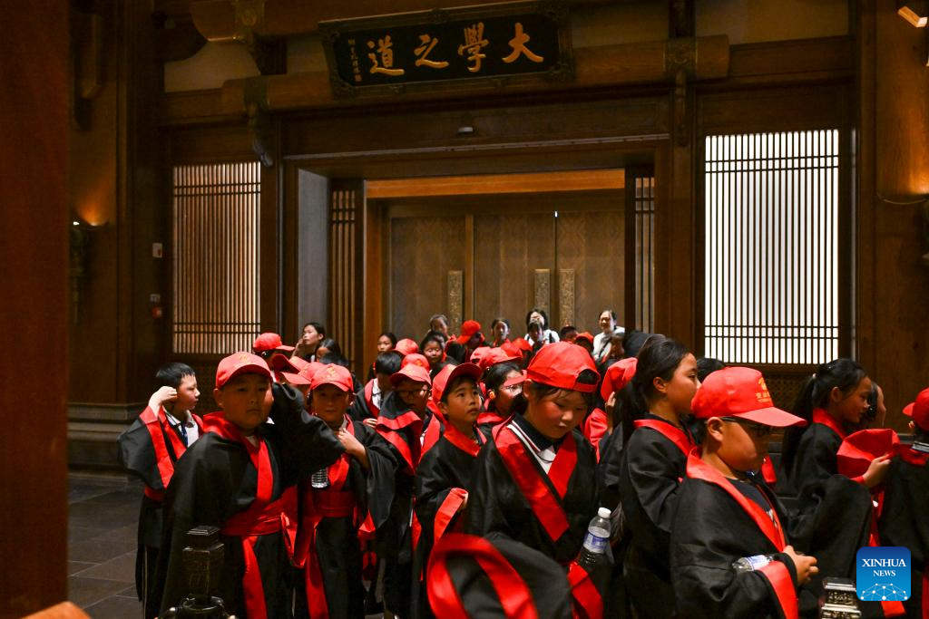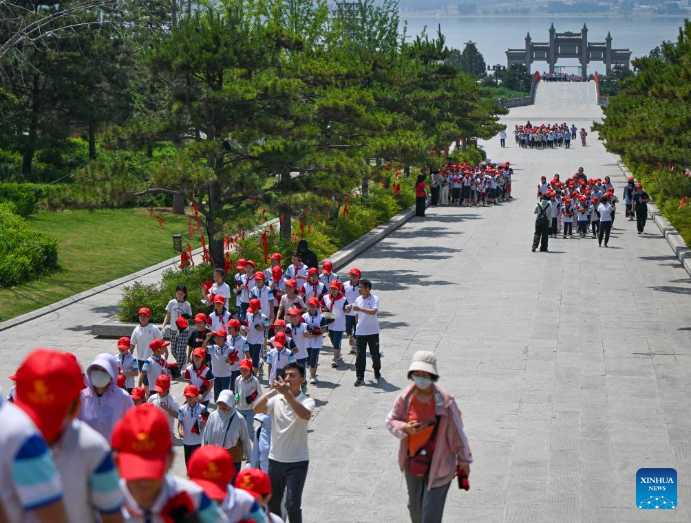 Students visit Nishan Sacredland scenic spot during a study tour in Qufu, east China's Shandong Province, May 21, 2025. Qufu, the birthplace of the renowned philosopher Confucius, has been blending Confucian culture with tourism, featuring a variety of art performances, exhibitions and folk culture activities, which attract many visitors each year. (Xinhua/Chen Shuo)
