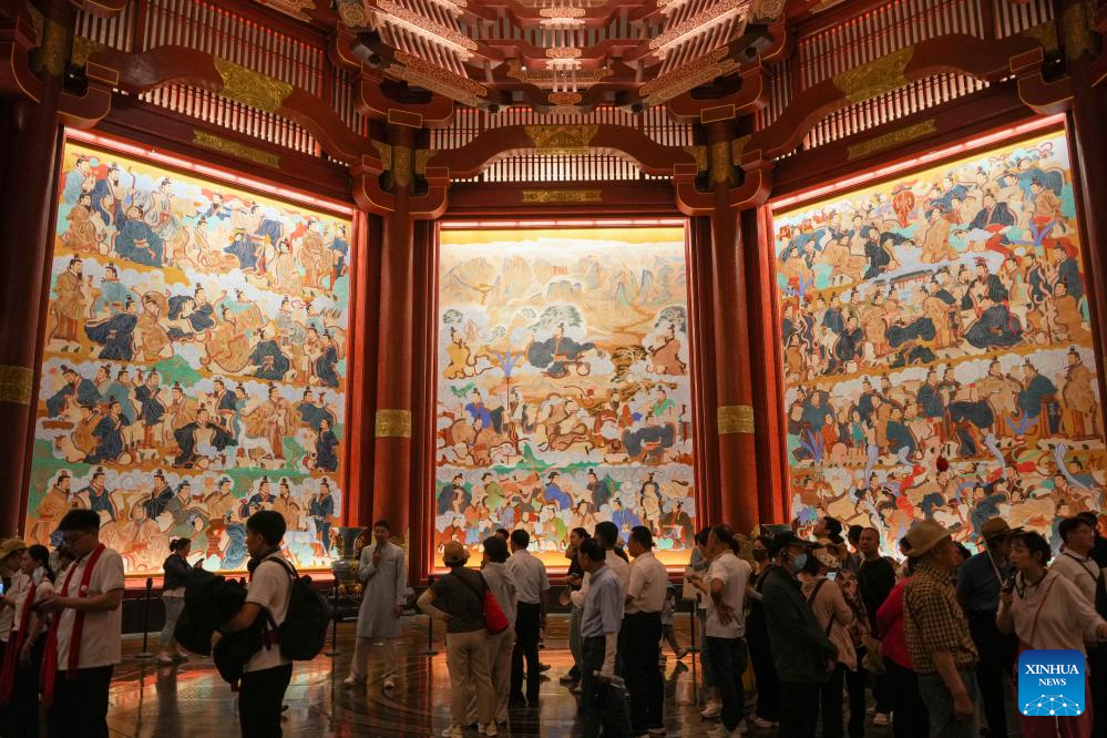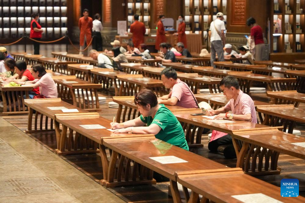 Tourists copy Analects of Confucius at Nishan Sacredland scenic spot in Qufu, east China's Shandong Province, May 21, 2025. Qufu, the birthplace of the renowned philosopher Confucius, has been blending Confucian culture with tourism, featuring a variety of art performances, exhibitions and folk culture activities, which attract many visitors each year. (Xinhua/Xu Suhui)