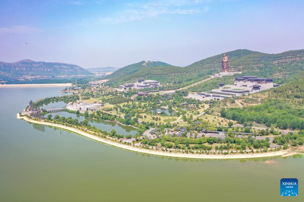 A drone photo shows the Nishan Reservoir and Nishan Sacredland scenic spot in Qufu, east China's Shandong Province, May 21, 2025. Qufu, the birthplace of the renowned philosopher Confucius, has been blending Confucian culture with tourism, featuring a variety of art performances, exhibitions and folk culture activities, which attract many visitors each year. (Xinhua/Xu Suhui)