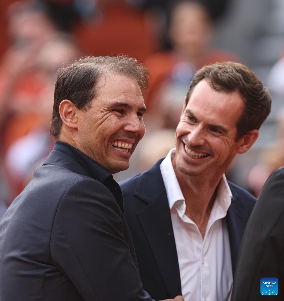 Andy Murray (R) and Rafael Nadal react during a ceremony held for former Spanish tennis player Rafael Nadal honoring his career during the French Open tennis tournament on Court Philippe Chatrier at the Roland Garros in Paris, France, May 25, 2025. (Xinhua/Li Jing)