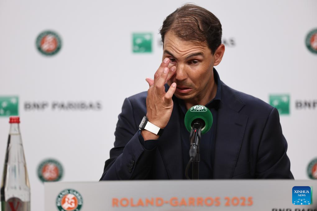 Former Spanish tennis player Rafael Nadal reacts during a press conference after a ceremony honoring his career during the French Open tennis tournament on Court Philippe Chatrier at the Roland Garros in Paris, France, May 25, 2025. (Xinhua/Li Jing)