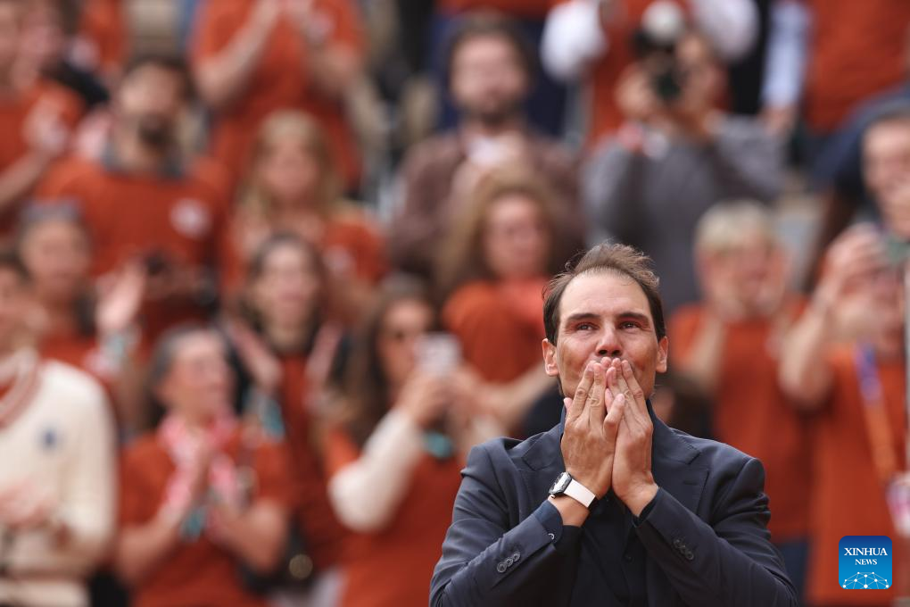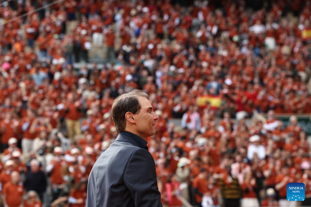 Former Spanish tennis player Rafael Nadal reacts during a ceremony honoring his career during the French Open tennis tournament on Court Philippe Chatrier at the Roland Garros in Paris, France, May 25, 2025. (Xinhua/Li Jing)