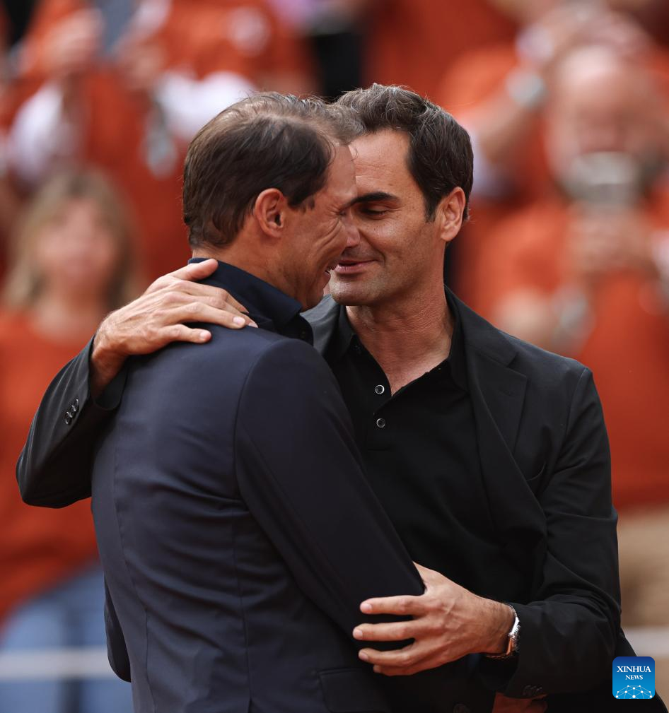 Roger Federer (R) hugs Rafael Nadal during a ceremony held for former Spanish tennis player Rafael Nadal honoring his career during the French Open tennis tournament on Court Philippe Chatrier at the Roland Garros in Paris, France, May 25, 2025. (Xinhua/Li Jing)