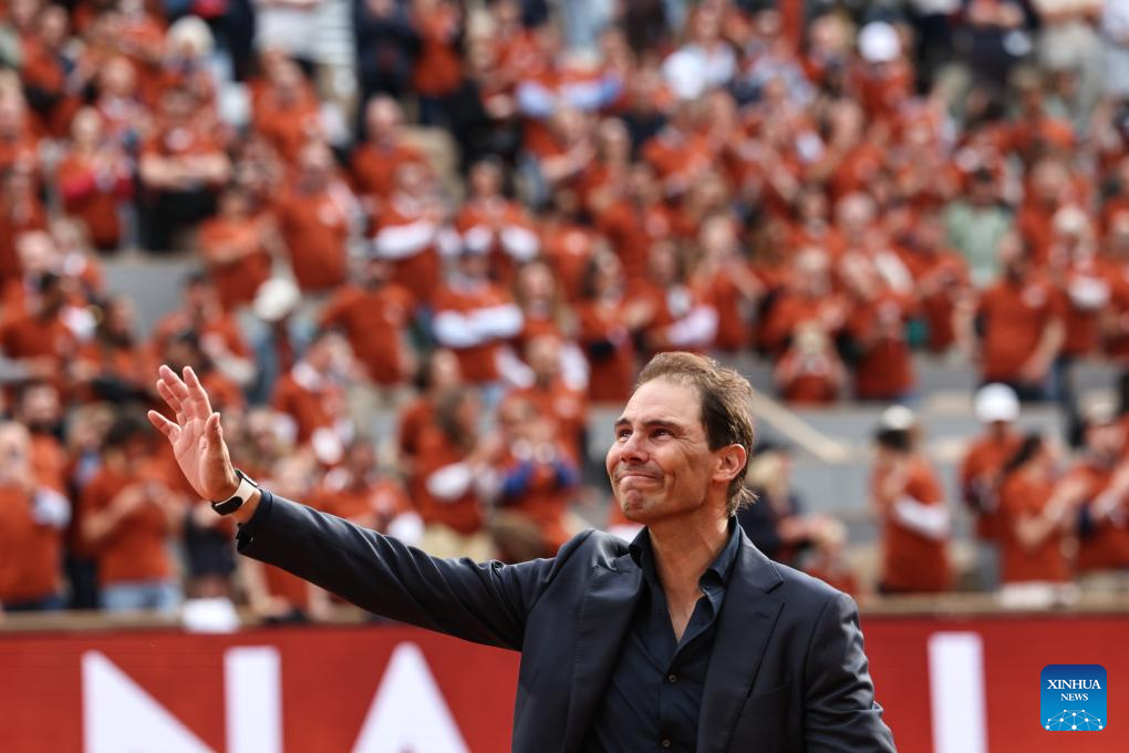 Former Spanish tennis player Rafael Nadal waves to the crowd during a ceremony honoring his career during the French Open tennis tournament on Court Philippe Chatrier at the Roland Garros in Paris, France, May 25, 2025. (Xinhua/Li Jing)