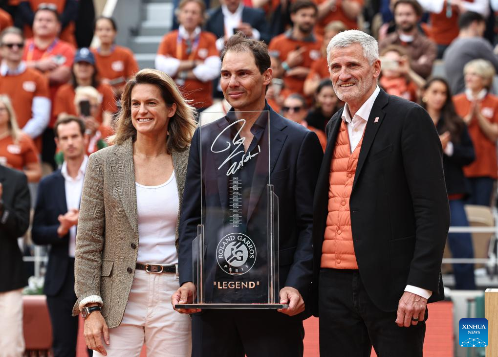 Roland Garros Open tennis tournament's director Amelie Mauresmo (L) and President of the French Tennis Federation Gilles Moretton (R) present a memorial trophy for former Spanish tennis player Rafael Nadal during a ceremony honoring his career during the French Open tennis tournament on Court Philippe Chatrier at the Roland Garros in Paris, France, May 25, 2025. (Xinhua/Li Jing)