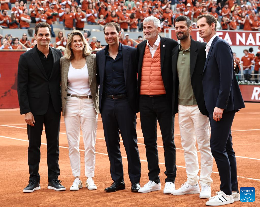 Roger Federer, Amelie Mauresmo, Rafael Nadal, Gilles Moretton, Novak Djokovic and Andy Murray (from L to R) pose for a photo during a ceremony held for former Spanish tennis player Rafael Nadal honoring his career during the French Open tennis tournament on Court Philippe Chatrier at the Roland Garros in Paris, France, May 25, 2025. (Xinhua/Li Jing)