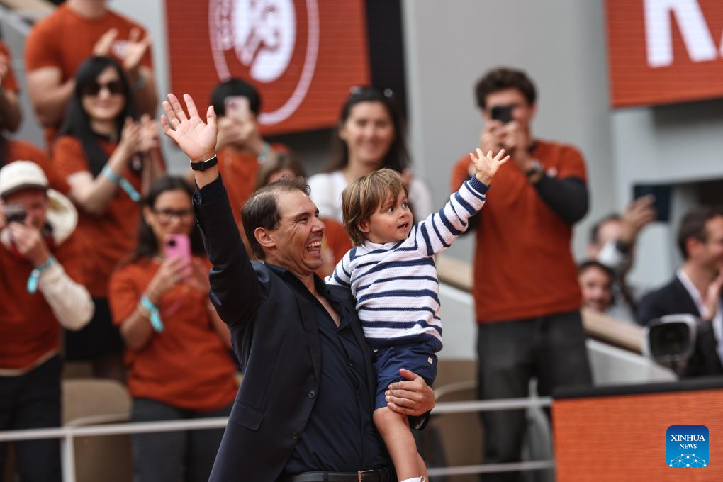 Former Spanish tennis player Rafael Nadal with his son waves to the crowd during a ceremony honoring his career during the French Open tennis tournament on Court Philippe Chatrier at the Roland Garros in Paris, France, May 25, 2025. (Xinhua/Li Jing)