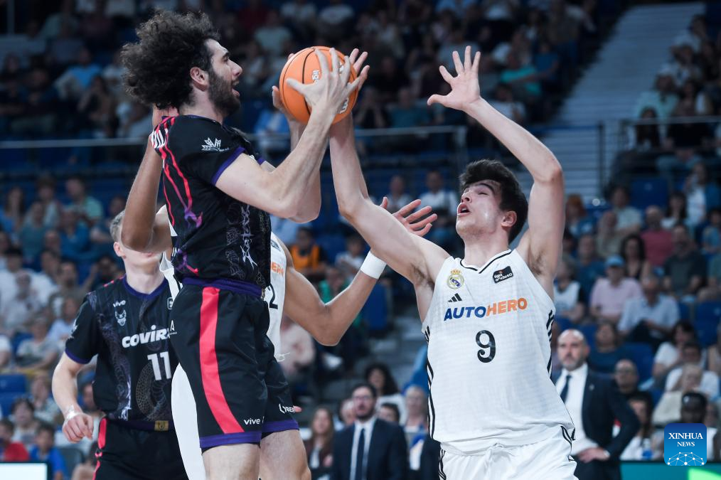 Real Madrid's Hugo Gonzalez (R) vies with Coviran Granada's Giorgi Bezhanishvili during the Liga ACB basketball match between Real Madrid and Granada in Madrid, Spain, May 25, 2025. (Photo by Gustavo Valiente/Xinhua)