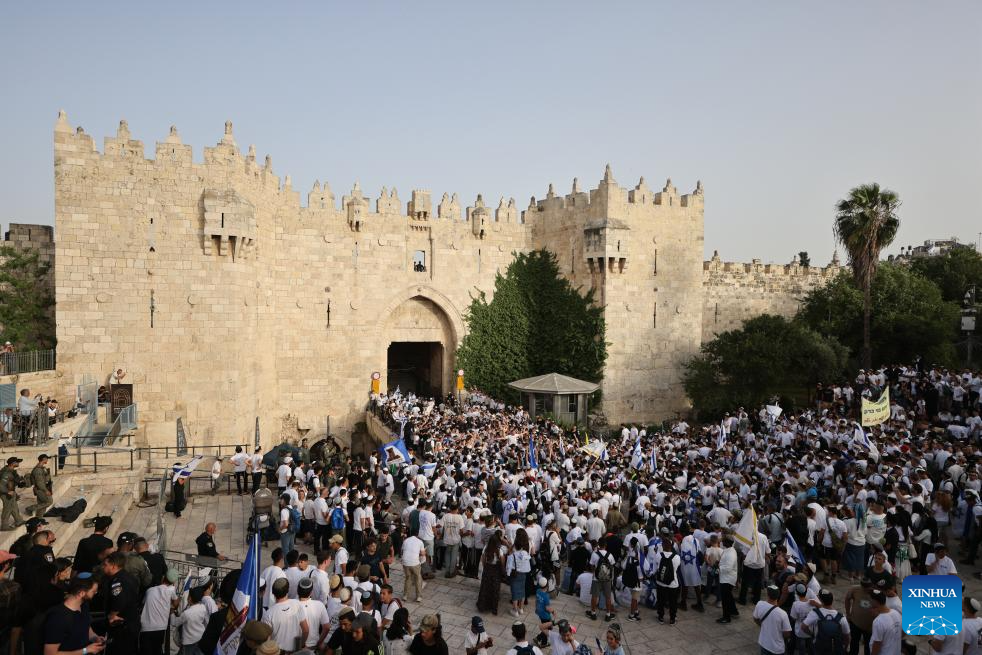 Far-right Israeli activists take part in a flag march to mark Jerusalem Day in Jerusalem's Old City, on May 26, 2025. Crowds of young far-right Israeli activists attacked Palestinians in East Jerusalem's Old City on Monday as they marched through the narrow streets to mark Israel's occupation of the eastern part of the city. (Xinhua/Chen Junqing)