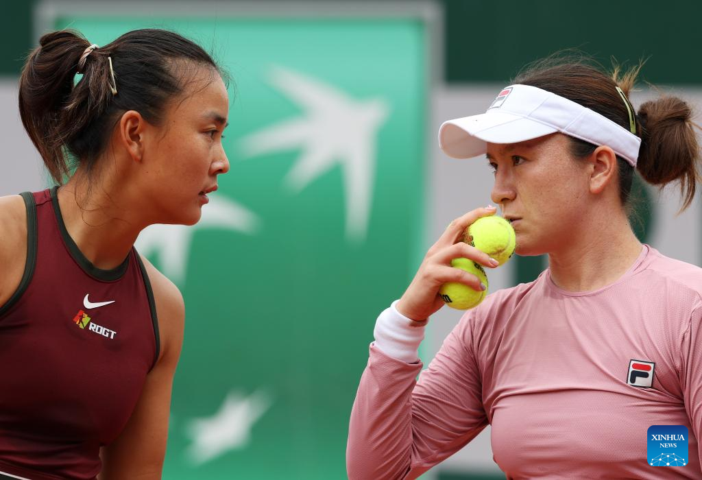 Lulu Sun/Yuan Yue (L) compete during the women's doubles first round match between Lulu Sun (New Zealand)/Yuan Yue (China) and Anna Blinkova (Russia)/Mayar Sherif (Egypt) at the French Open tennis tournament at Roland Garros, Paris, France, May 27, 2025. (Xinhua/Gao Jing)