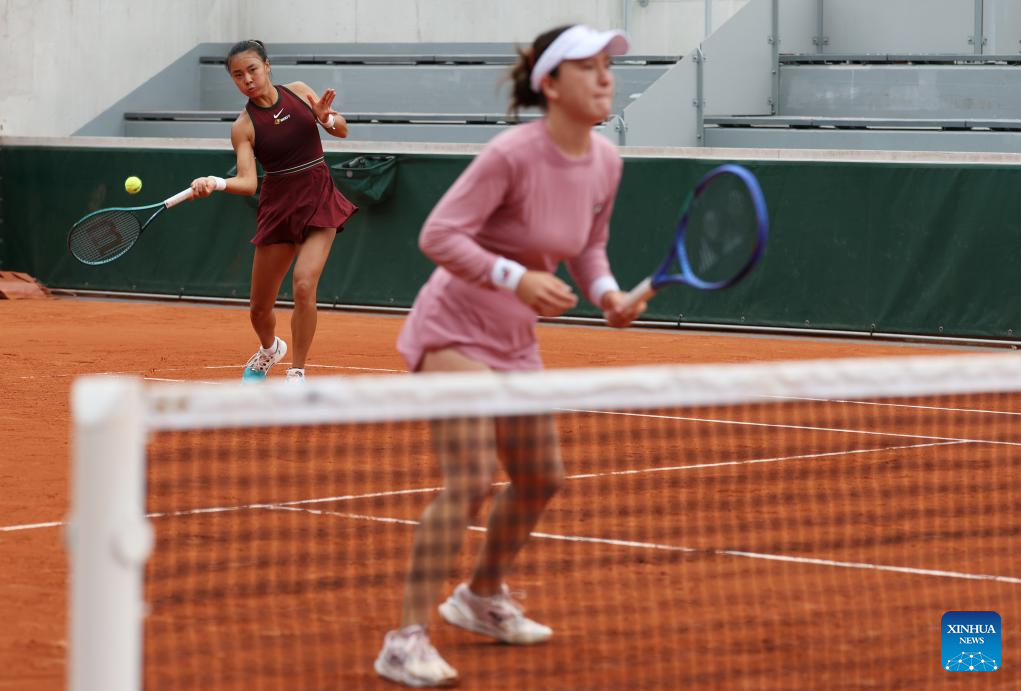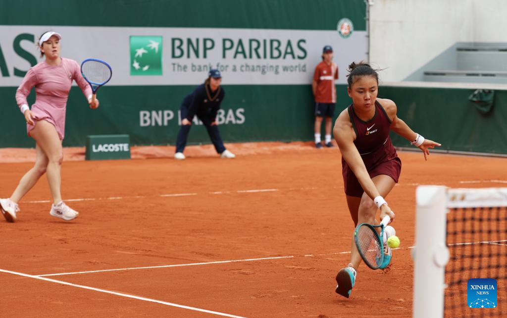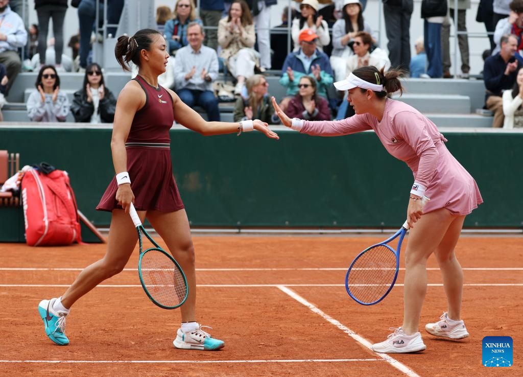 Lulu Sun/Yuan Yue (R) compete during the women's doubles first round match between Lulu Sun (New Zealand)/Yuan Yue (China) and Anna Blinkova (Russia)/Mayar Sherif (Egypt) at the French Open tennis tournament at Roland Garros, Paris, France, May 27, 2025. (Xinhua/Gao Jing)