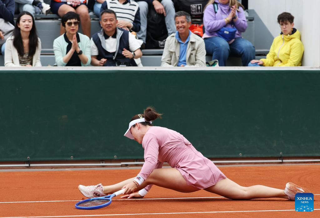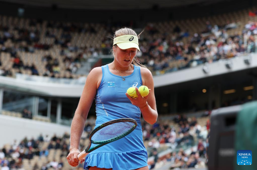 Olivia Gadecki reacts during the women's singles first round match between Coco Gauff of the United States and Olivia Gadecki of Australia at the French Open tennis tournament at Roland Garros, Paris, France, May 27, 2025. (Xinhua/Gao Jing)