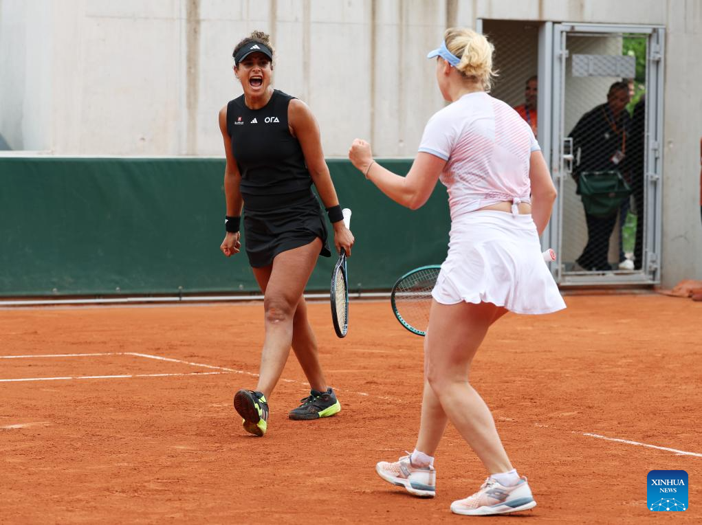 Lulu Sun/Yuan Yue (L) celebrate scoring during the women's doubles first round match between Lulu Sun (New Zealand)/Yuan Yue (China) and Anna Blinkova (Russia)/Mayar Sherif (Egypt) at the French Open tennis tournament at Roland Garros, Paris, France, May 27, 2025. (Xinhua/Gao Jing)