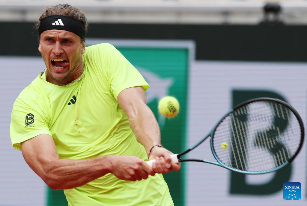 Alexander Zverev hits a return during the men's singles first round match between Alexander Zverev of Germany and Learner Tien of the United States at the French Open tennis tournament at Roland Garros, Paris, France, May 27, 2025. (Xinhua/Gao Jing)