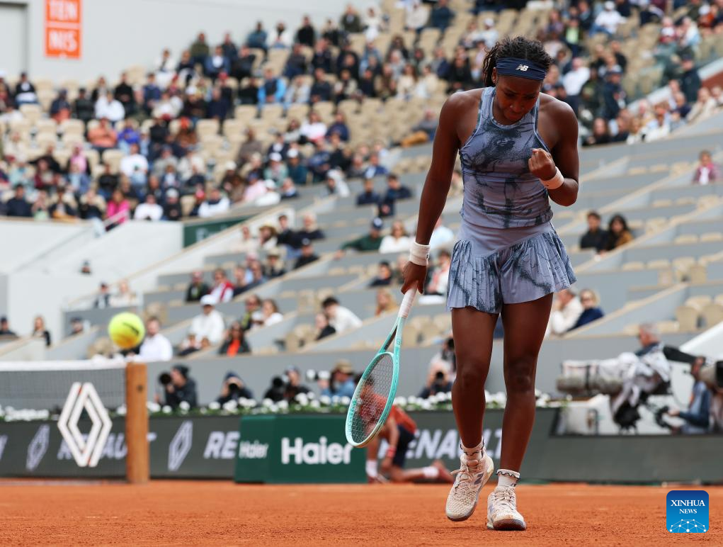 Coco Gauff celebrates scoring during the women's singles first round match between Coco Gauff of the United States and Olivia Gadecki of Australia at the French Open tennis tournament at Roland Garros, Paris, France, May 27, 2025. (Xinhua/Gao Jing)