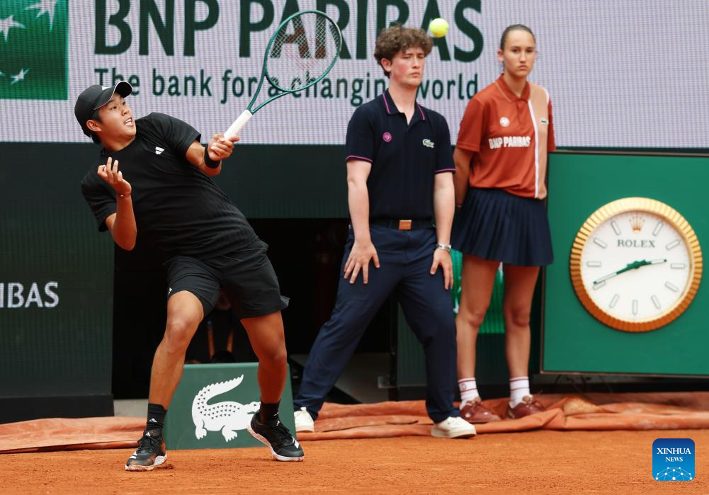 Learner Tien hits a return during the men's singles first round match between Alexander Zverev of Germany and Learner Tien of the United States at the French Open tennis tournament at Roland Garros, Paris, France, May 27, 2025. (Xinhua/Gao Jing)