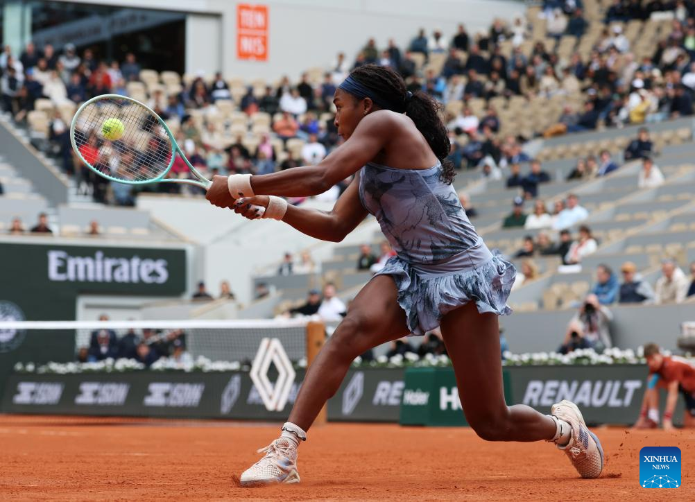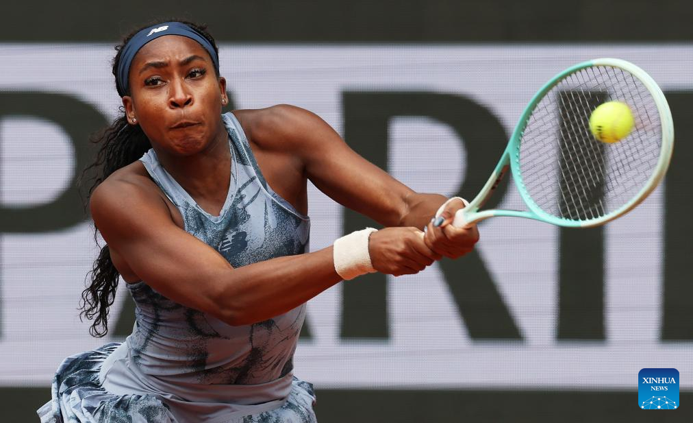 Coco Gauff hits a return during the women's singles first round match between Coco Gauff of the United States and Olivia Gadecki of Australia at the French Open tennis tournament at Roland Garros, Paris, France, May 27, 2025. (Xinhua/Gao Jing)