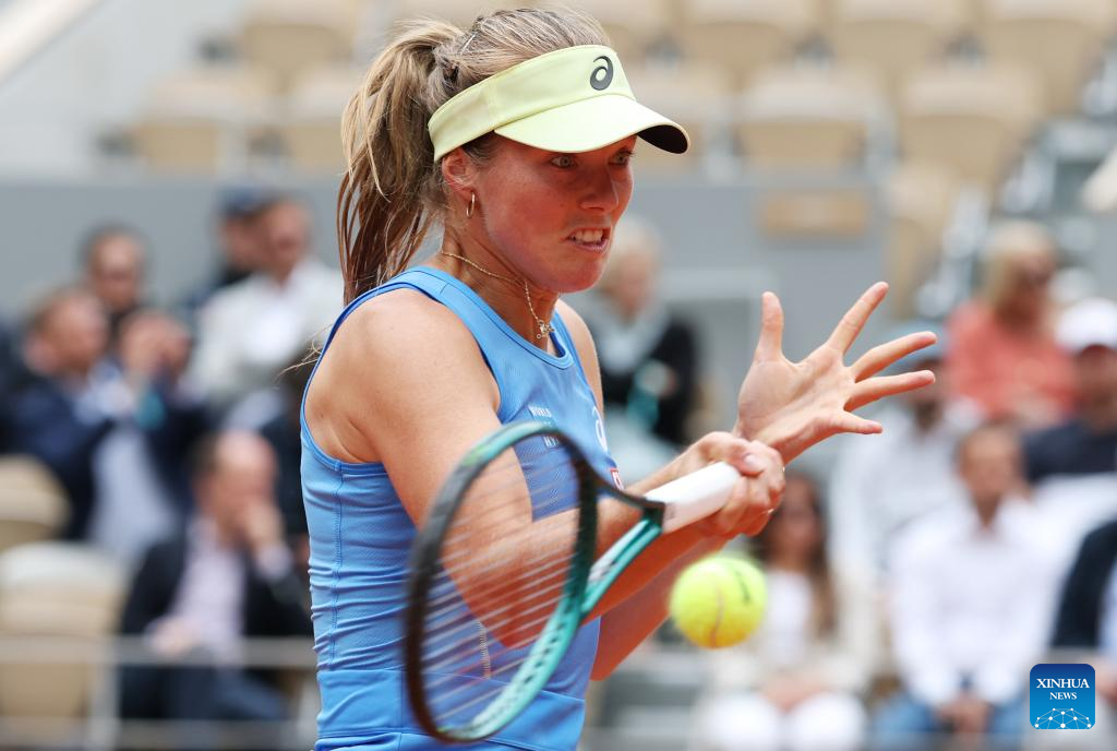 Olivia Gadecki hits a return during the women's singles first round match between Coco Gauff of the United States and Olivia Gadecki of Australia at the French Open tennis tournament at Roland Garros, Paris, France, May 27, 2025. (Xinhua/Gao Jing)