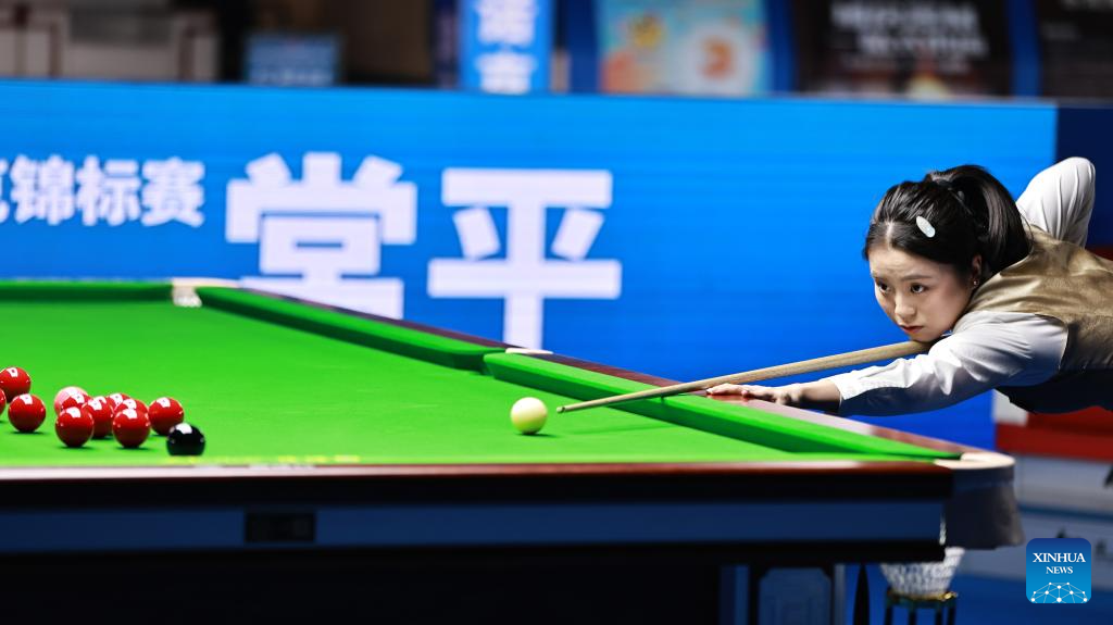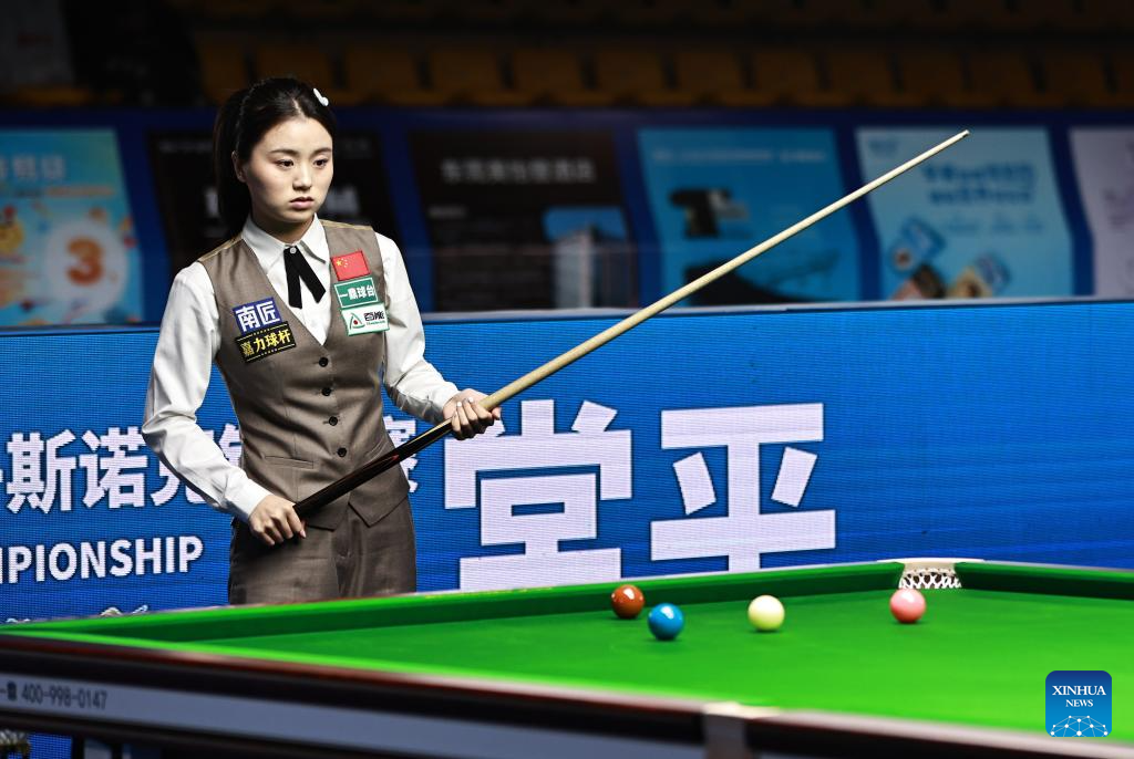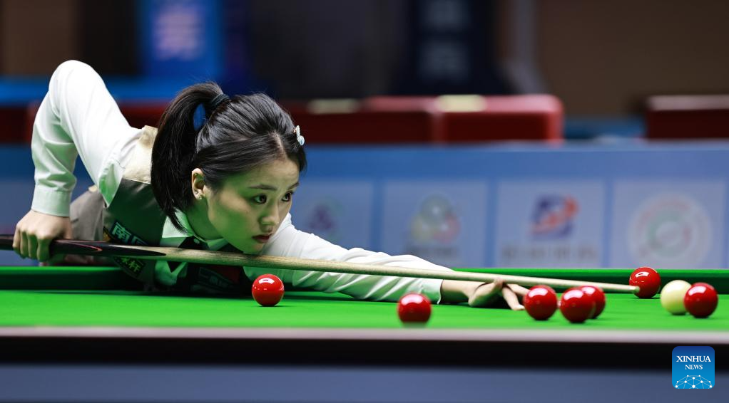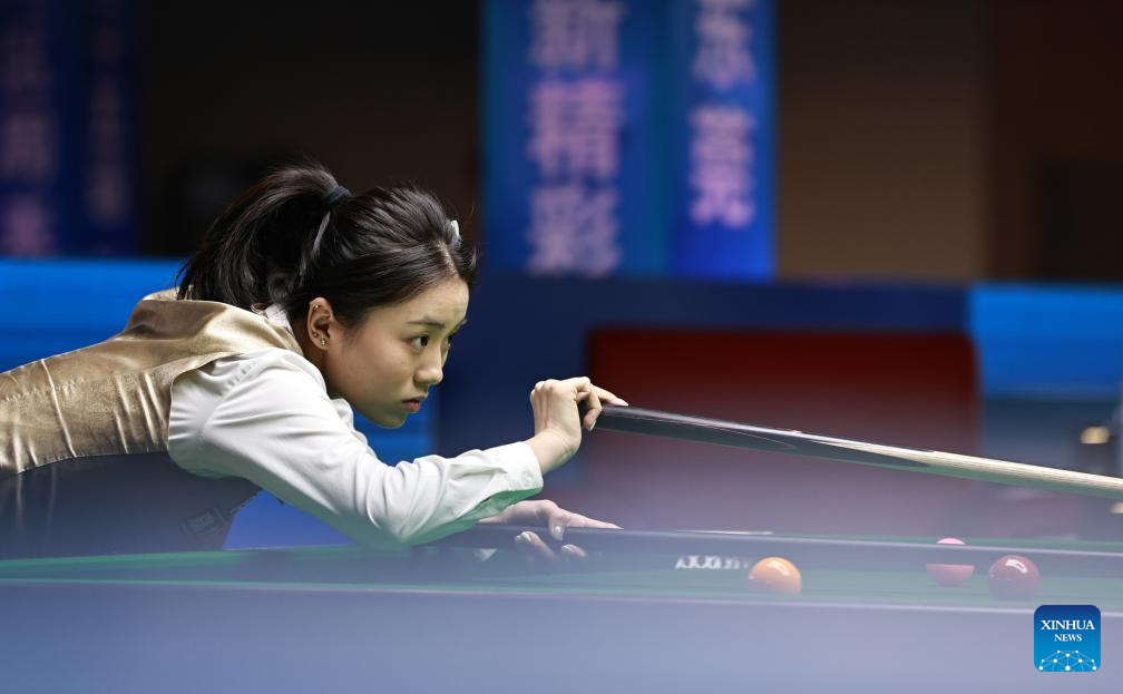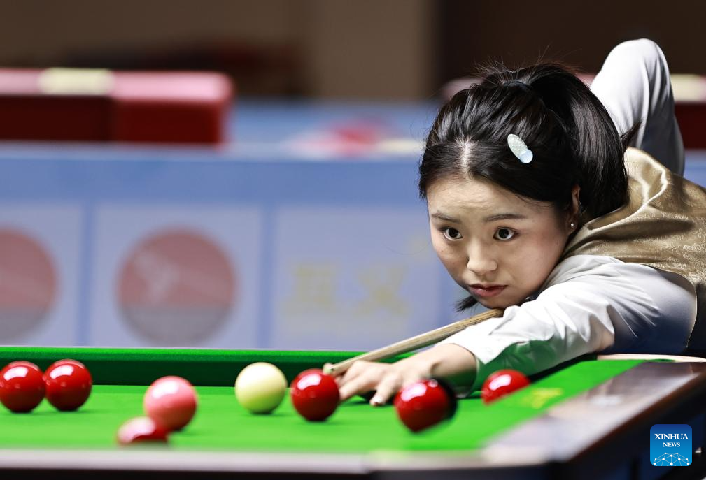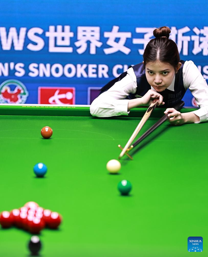 Bai Yulu of China competes against Nutcharut Wongharuthai of Thailand in the final at 2025 World Women's Snooker Championship in Dongguan, south China's Guangdong Province, May 27, 2025. (Xinhua/Huang Guobao)