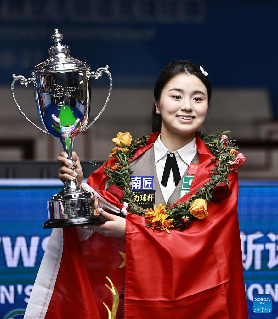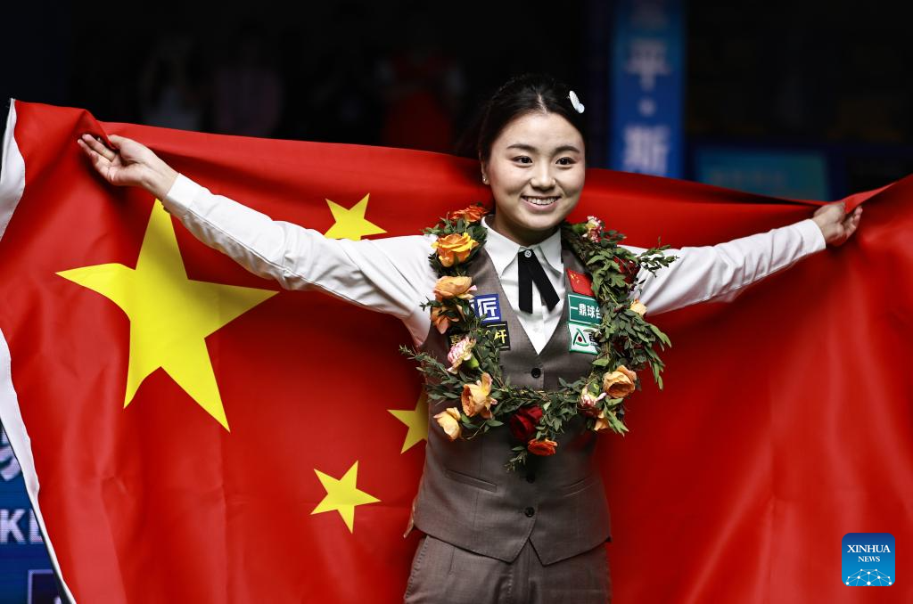 Bai Yulu of China celebrates after defeating Nutcharut Wongharuthai of Thailand in the final at 2025 World Women's Snooker Championship in Dongguan, south China's Guangdong Province, May 27, 2025. (Xinhua/Huang Guobao)