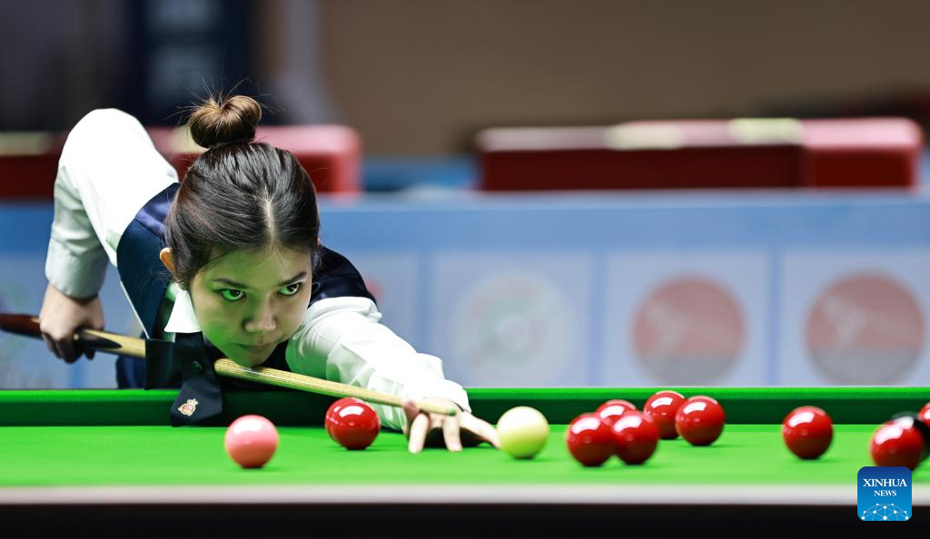 Nutcharut Wongharuthai of Thailand competes against Bai Yulu of China in the final at 2025 World Women's Snooker Championship in Dongguan, south China's Guangdong Province, May 27, 2025. (Xinhua/Huang Guobao)