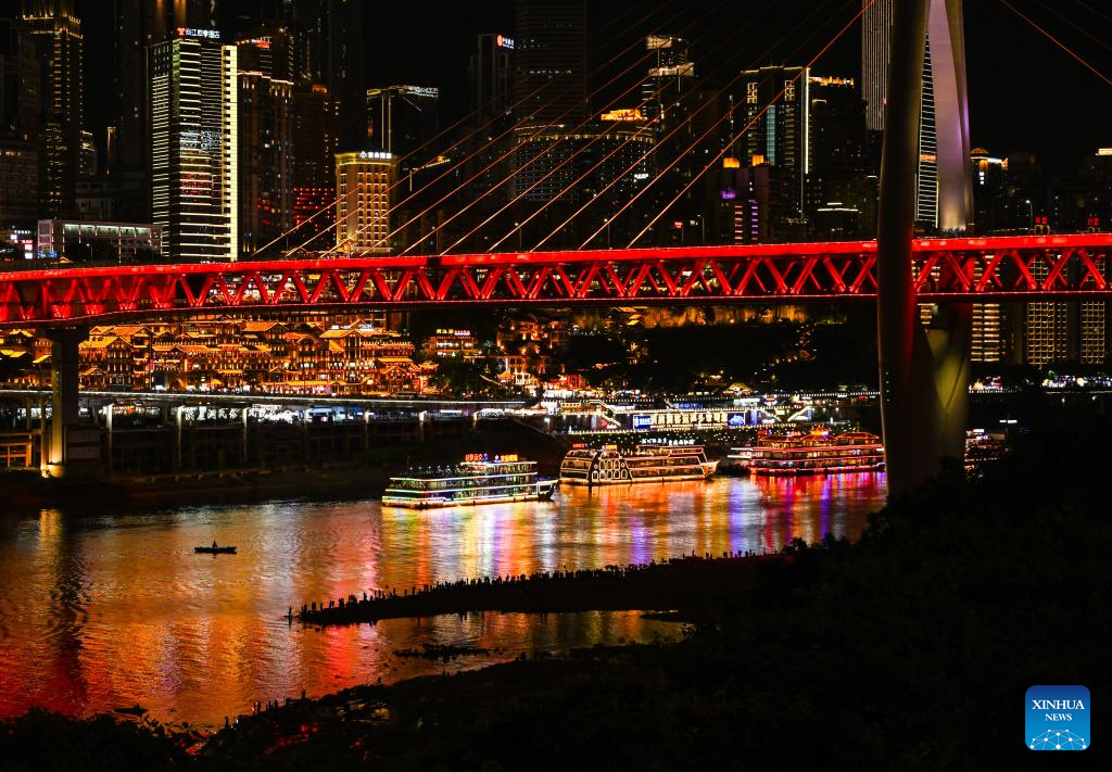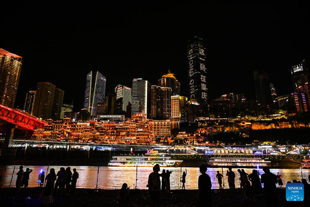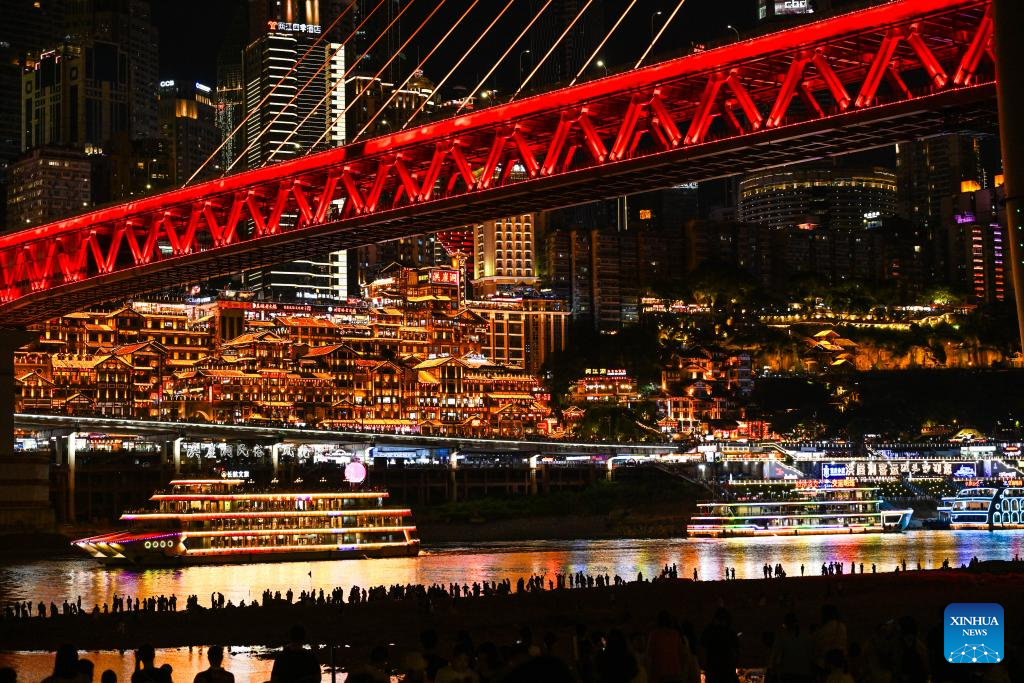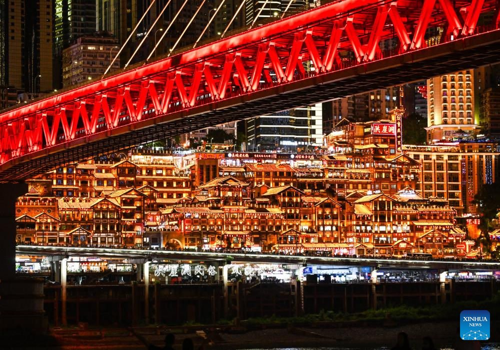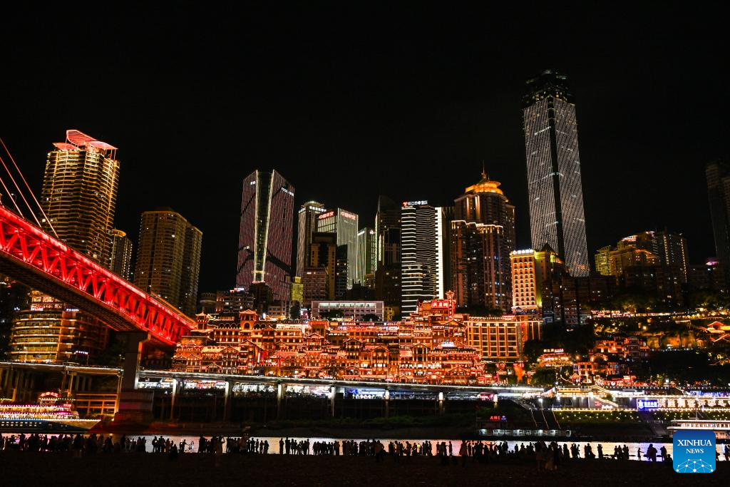 Tourists enjoy the night view of the Hongyadong scenic area by the Jialing River in southwest China's Chongqing, May 28, 2025. Hongyadong in Chongqing is an ancient city gate that has been transformed into a giant suspended building featuring restaurants and other entertainment venues. (Xinhua/Wang Quanchao)