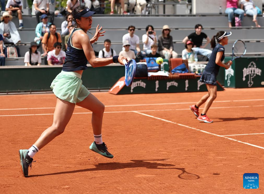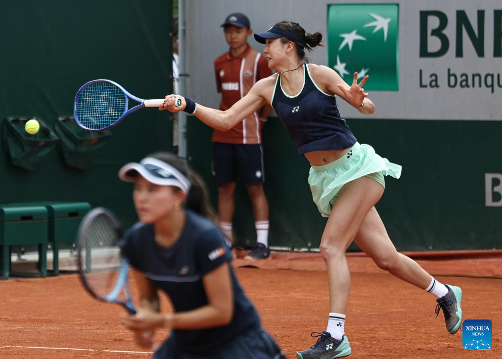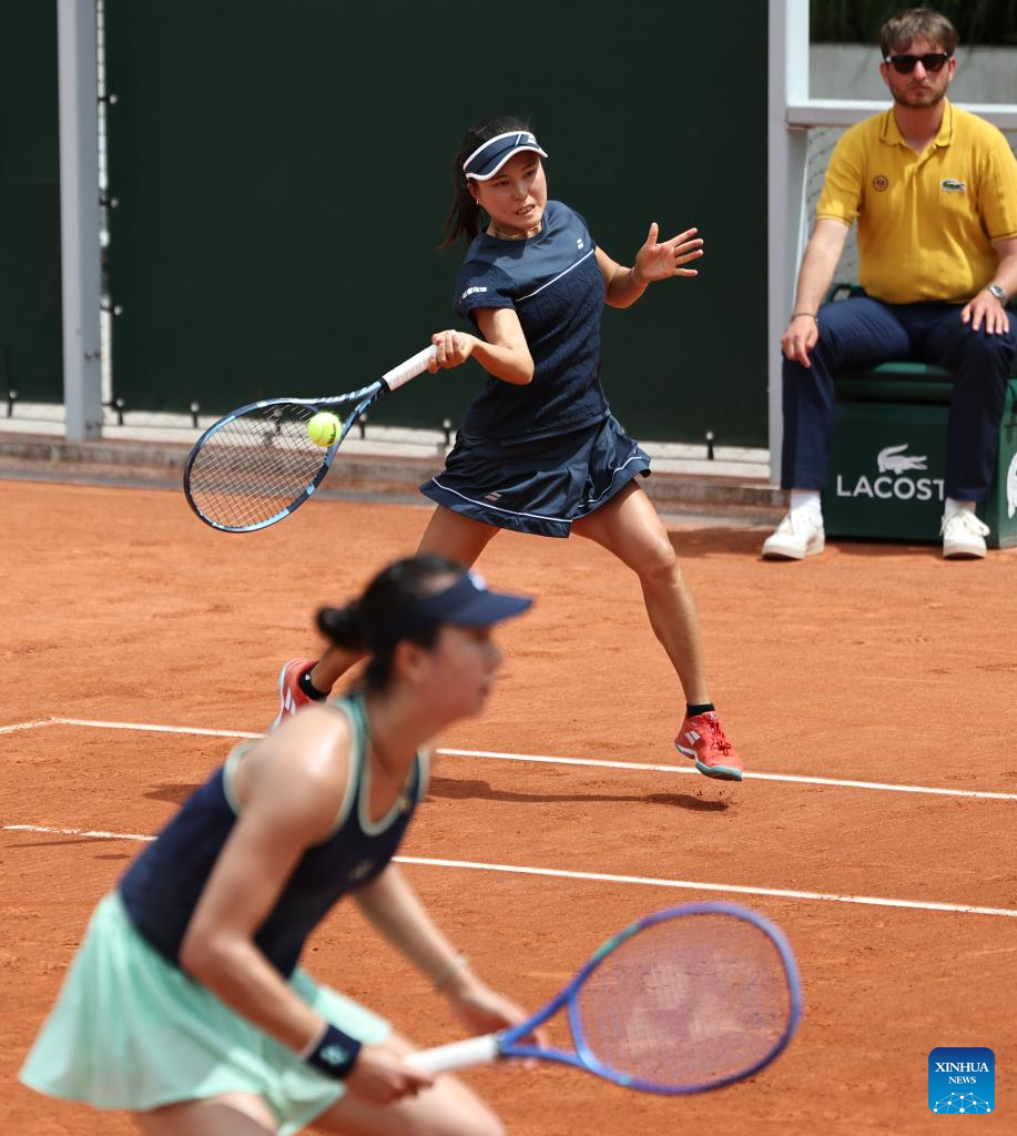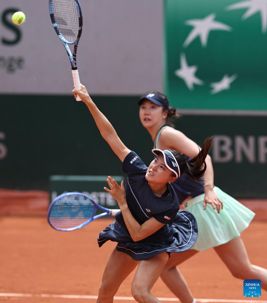 Wang Xinyu (L)/Zheng Saisai compete during the women's doubles 1st round match between Wang Xinyu/Zheng Saisai of China and Irina Khromacheva (Russia)/Fanny Stollar (Hungary) at the French Open tennis tournament at Roland Garros, Paris, France, May 29, 2025. (Xinhua/Gao Jing)