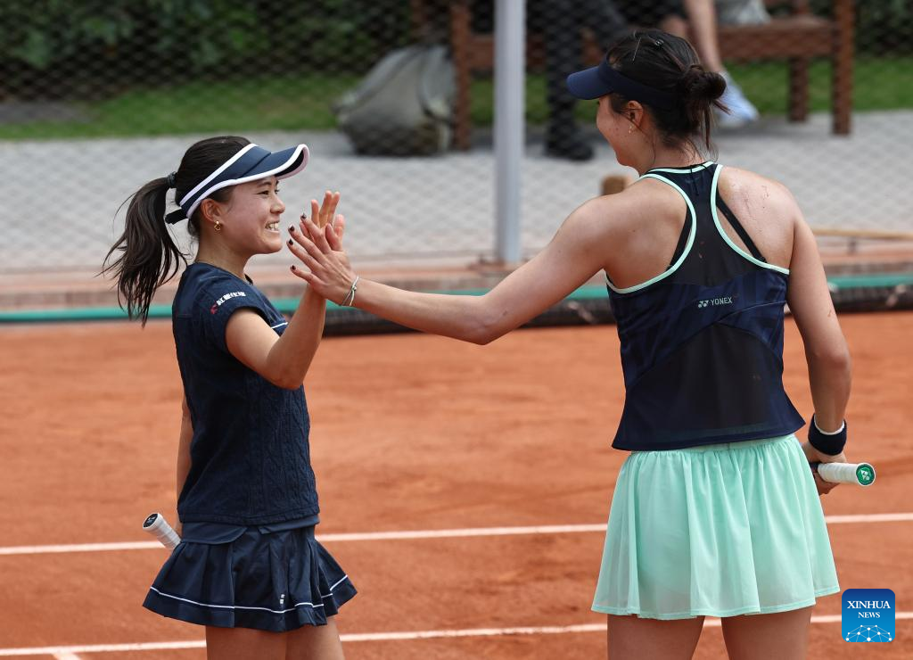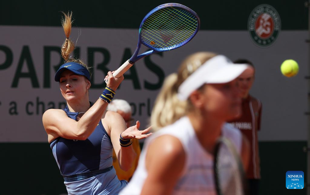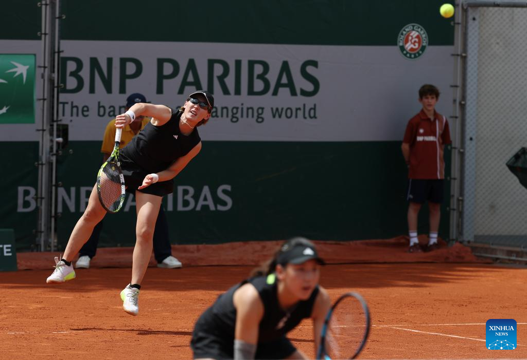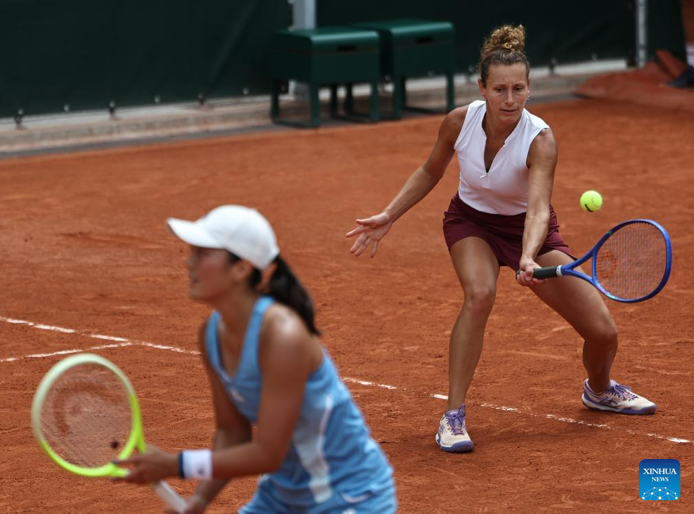 Irina Khromacheva/Fanny Stollar (L) compete during the women's doubles 1st round match between Wang Xinyu/Zheng Saisai of China and Irina Khromacheva (Russia)/Fanny Stollar (Hungary) at the French Open tennis tournament at Roland Garros, Paris, France, May 29, 2025. (Xinhua/Gao Jing)