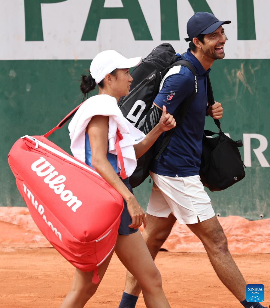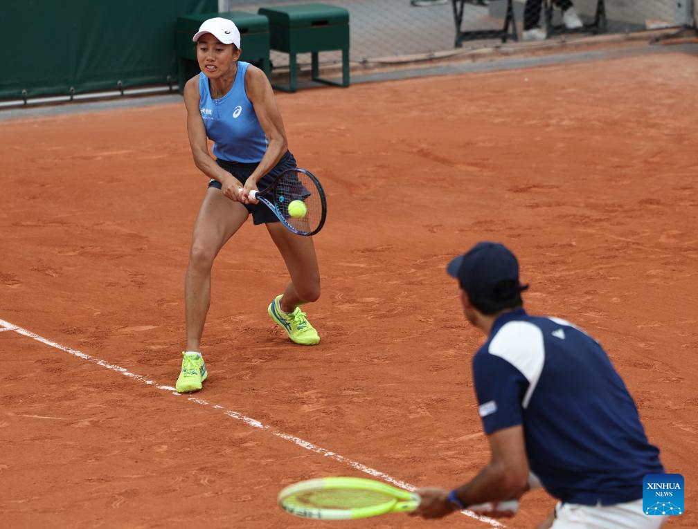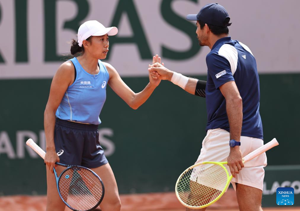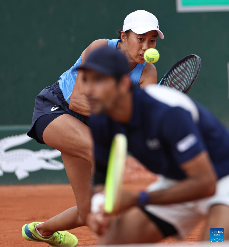 Zhang Shuai (L)/Marcelo Arevalo compete during the mixed doubles 1st round match between Zhang Shuai (China)/Marcelo Arevalo (El Salvador) and Julie Belgraver/Luca Sanchez of France at the French Open tennis tournament at Roland Garros, Paris, France, May 29, 2025. (Xinhua/Li Jing)
