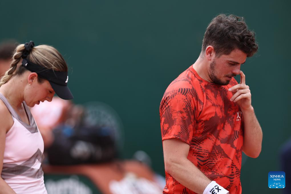 Julie Belgraver (L)/Luca Sanchez react during the mixed doubles 1st round match between Zhang Shuai (China)/Marcelo Arevalo (El Salvador) and Julie Belgraver/Luca Sanchez of France at the French Open tennis tournament at Roland Garros, Paris, France, May 29, 2025. (Xinhua/Li Jing)