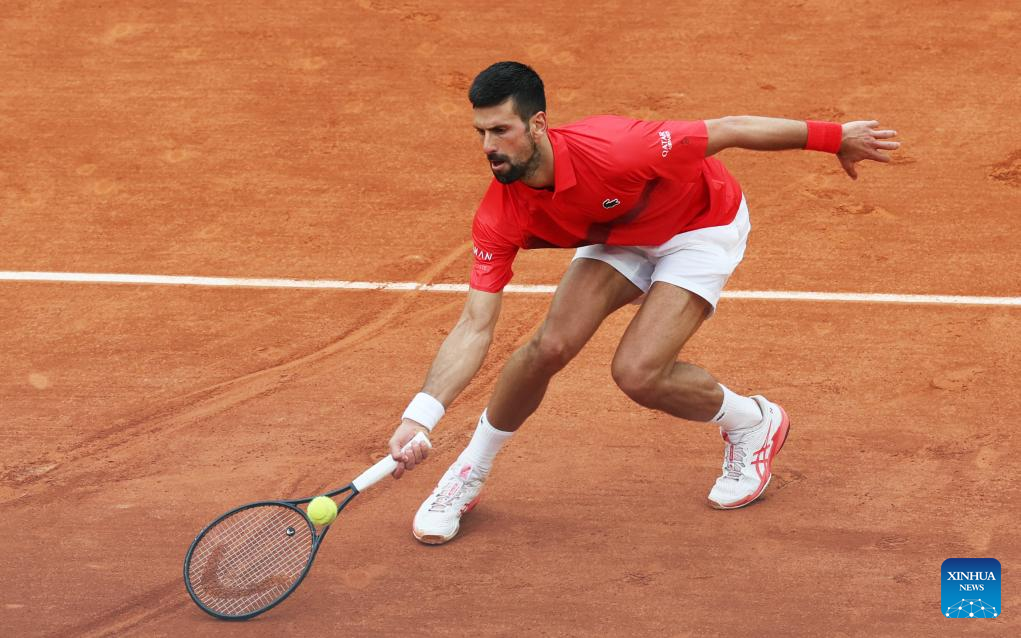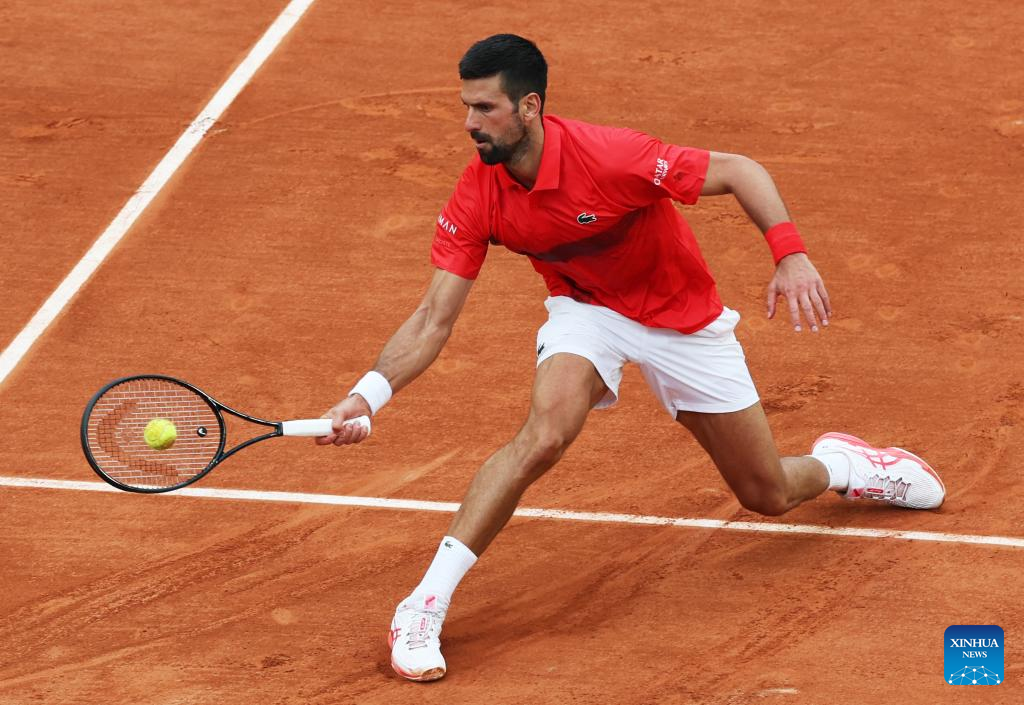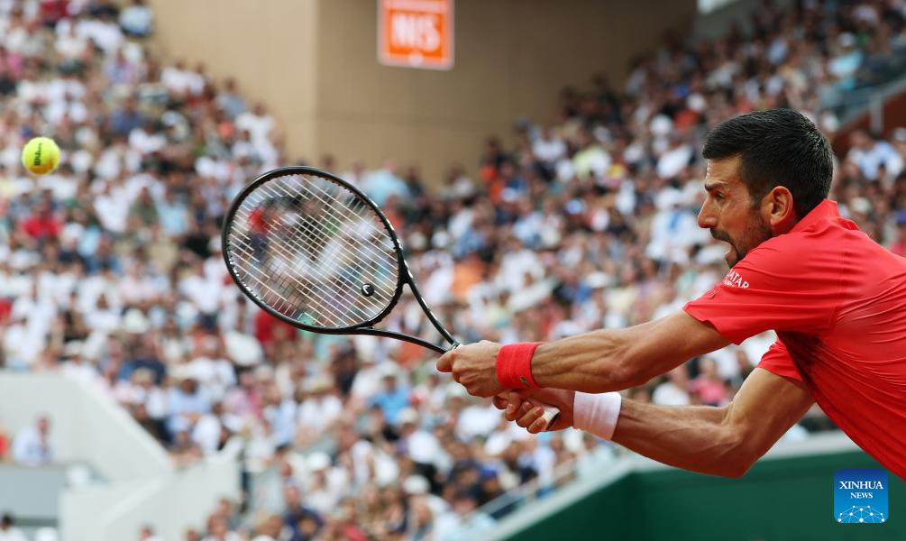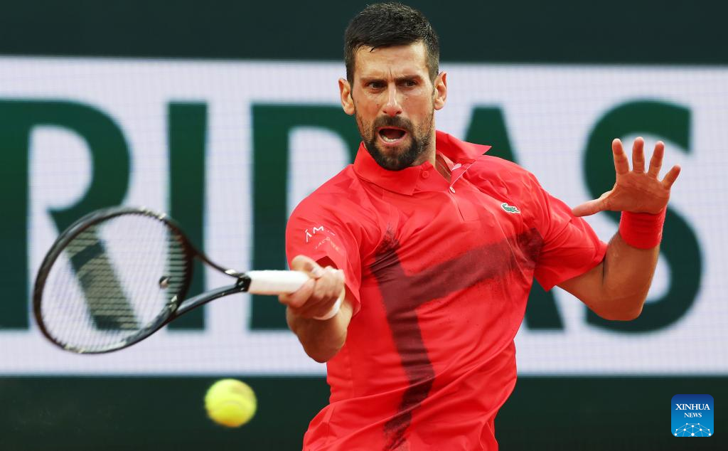 Novak Djokovic of Serbia hits a return during the men's singles second round match against Corentin Moutet of France at French Open tennis tournament 2025 in Paris, France, May 29, 2025. (Xinhua/Gao Jing)